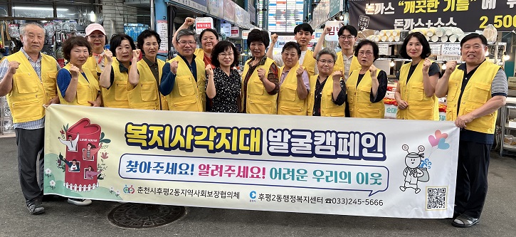 춘천시 후평2동 지역사회보장협의체(위원장 박정임)는 지난 6월 21일 후평일단지 시장을 방문해 복지사각지대 발굴을 위한 캠페인을 했다. 이날 캠페인에서는 지역사회보장협의체 위원들이 시장 일대를 돌아다니며 어려운 이웃을 발견하면 행정복지센터로 제보해 달라고 당부했다.
