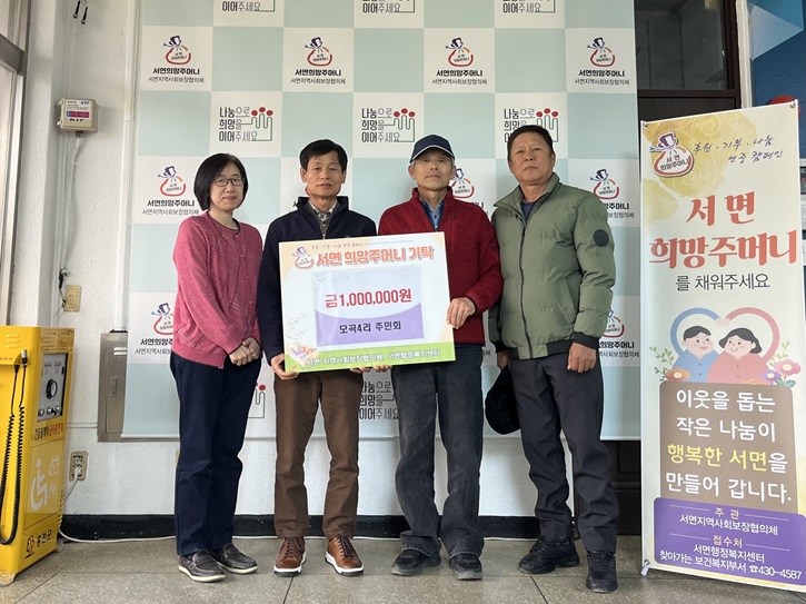 홍천군 서면 모곡4리 주민회(이장 김영선)는 지난 3월 4일 서면행정복지센터를 방문하여 불우이웃을 위해 사용해 달라며 성금 100만원을 기탁했다.