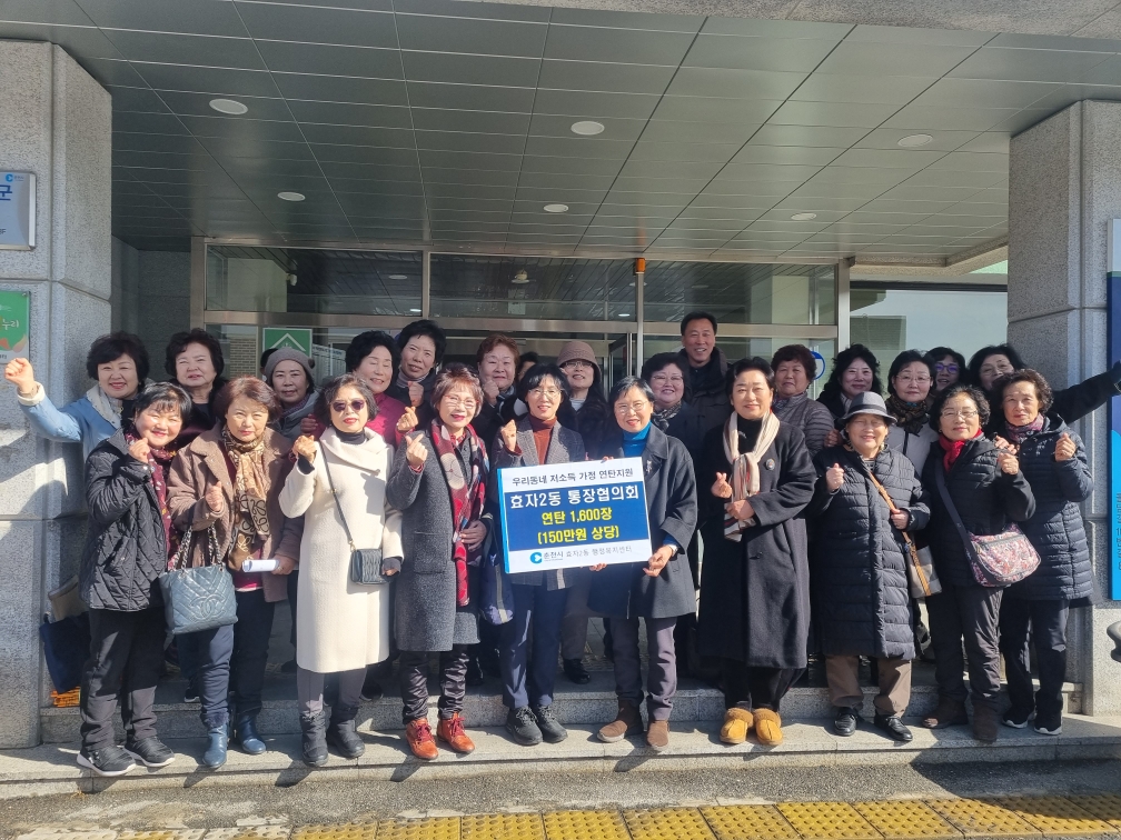 춘천시 효자2동 통장협의회(회장:김영숙)는 지난 2월 23일 효자2동 관내 저소득 가정에 연탄 1,600장(150만 원 상당)을 기부했다.