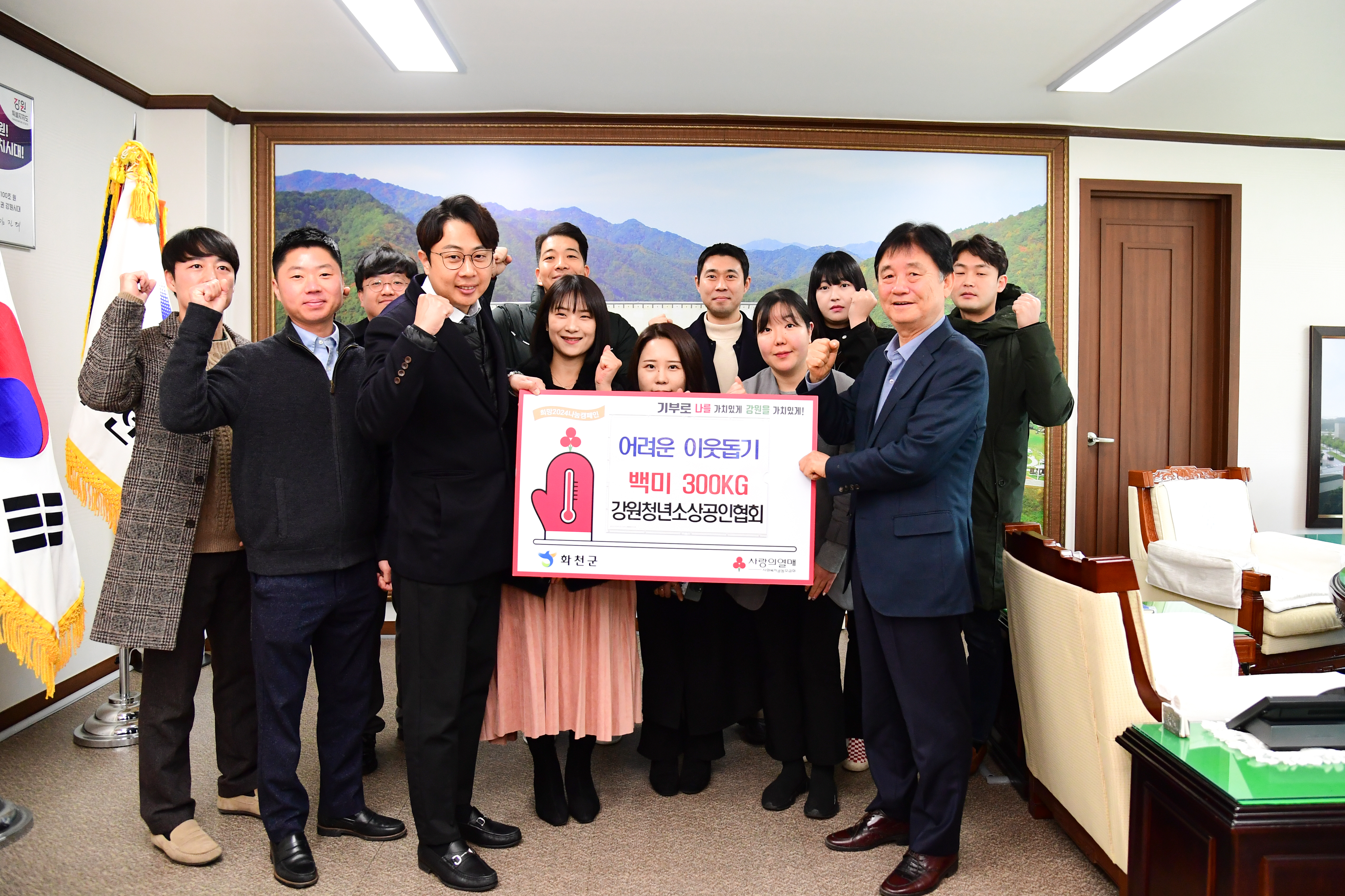 강원청년소상공인협회(회장:황재득) 회원들은 지난 2월 23일 화천군을 방문, 어려운 이웃에게 전달해 달라며 99만원 상당의 백미 300㎏을 최문순 화천군수에게 기탁했다.