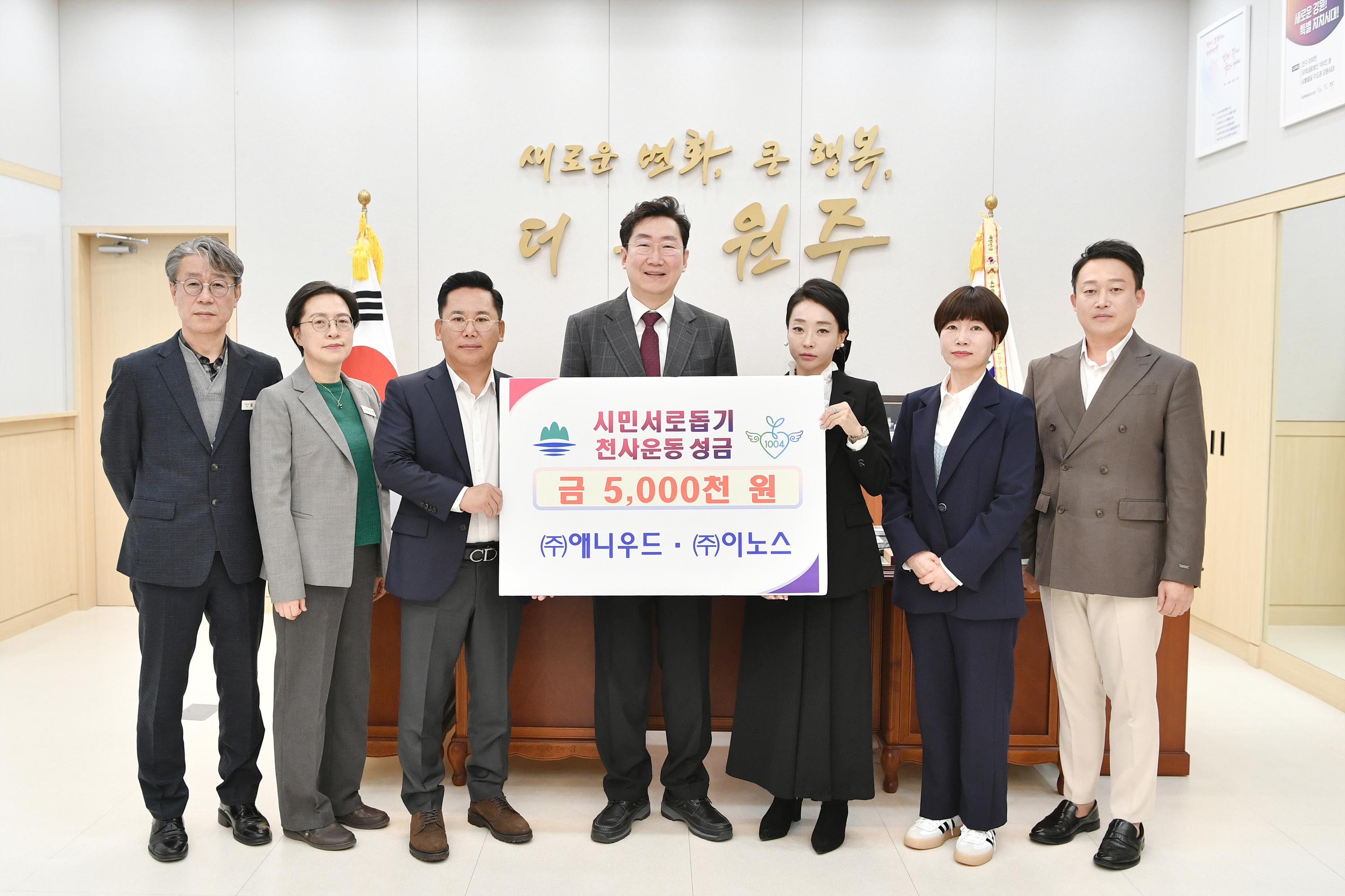 천사운동 후원금 5백만 원 전달 차상위계층(370세대)에 월 18만원 생계비 지원 등 (주)애니우드(대표이사 임철환), (주)이노스(대표이사 옥지우)는 지난 4월 9일 오전 원주시청 시장 집무실에서 시민서로돕기 천사운동 후원금 5백만 원을 기탁했다. 이날 전달식에는 (주)애니우드 임철환 대표이사, (주)이노스 옥지우 대표이...