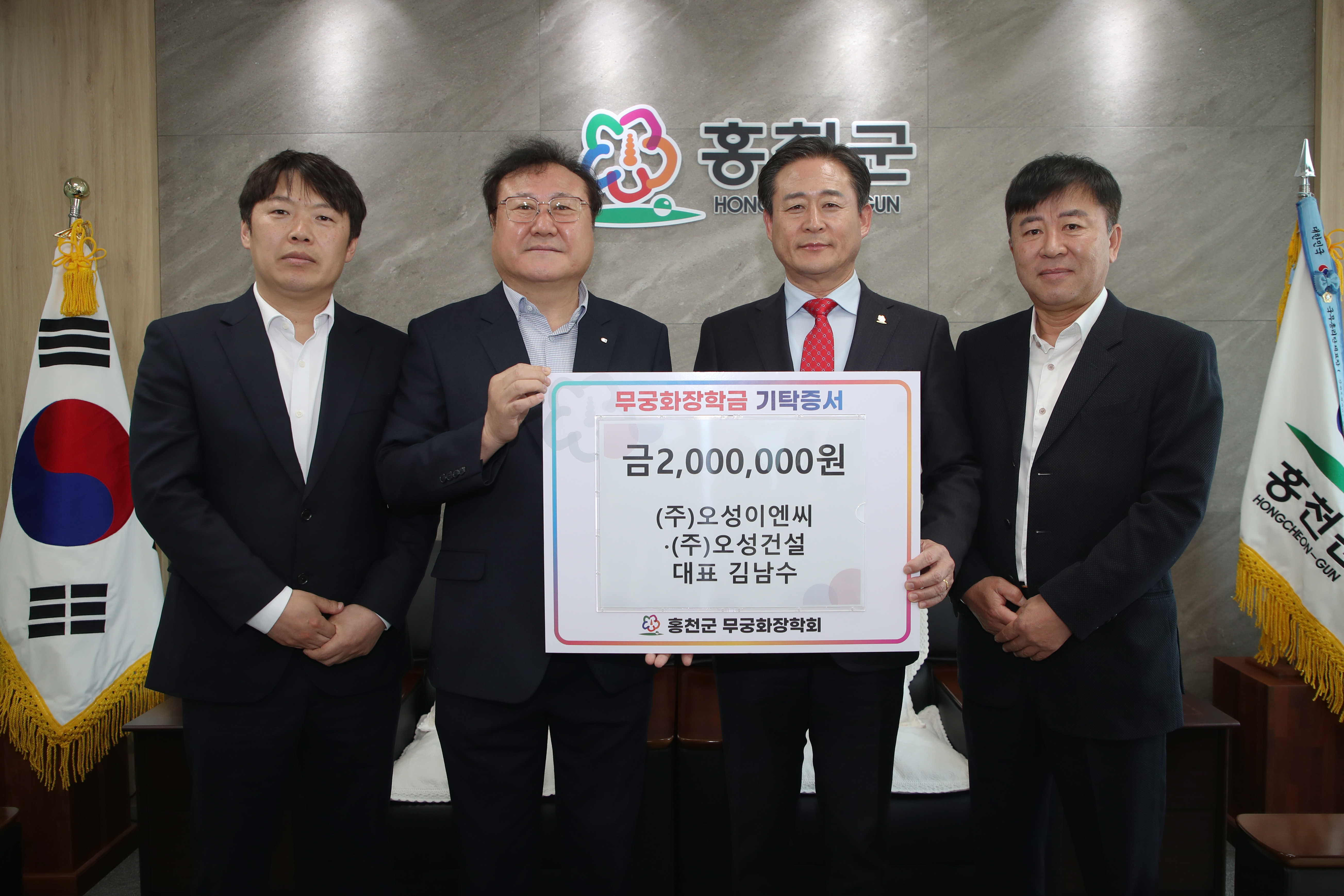 (주)오성이엔씨·오성건설(대표 김남수)는 지난 4월 9일 홍천군청을 방문하여 홍천군 인재육성을 위한 무궁화장학금 200만원을 기탁했다. (주)오성이엔씨·오성건설 김남수 대표는 “홍천군의 향토인재 육성을 위한 무궁화장학금을 기탁하게 되었다.”라고 말하며, “앞으로도 홍천군과 협력하여 지역경제 발전과 홍천군 인재...