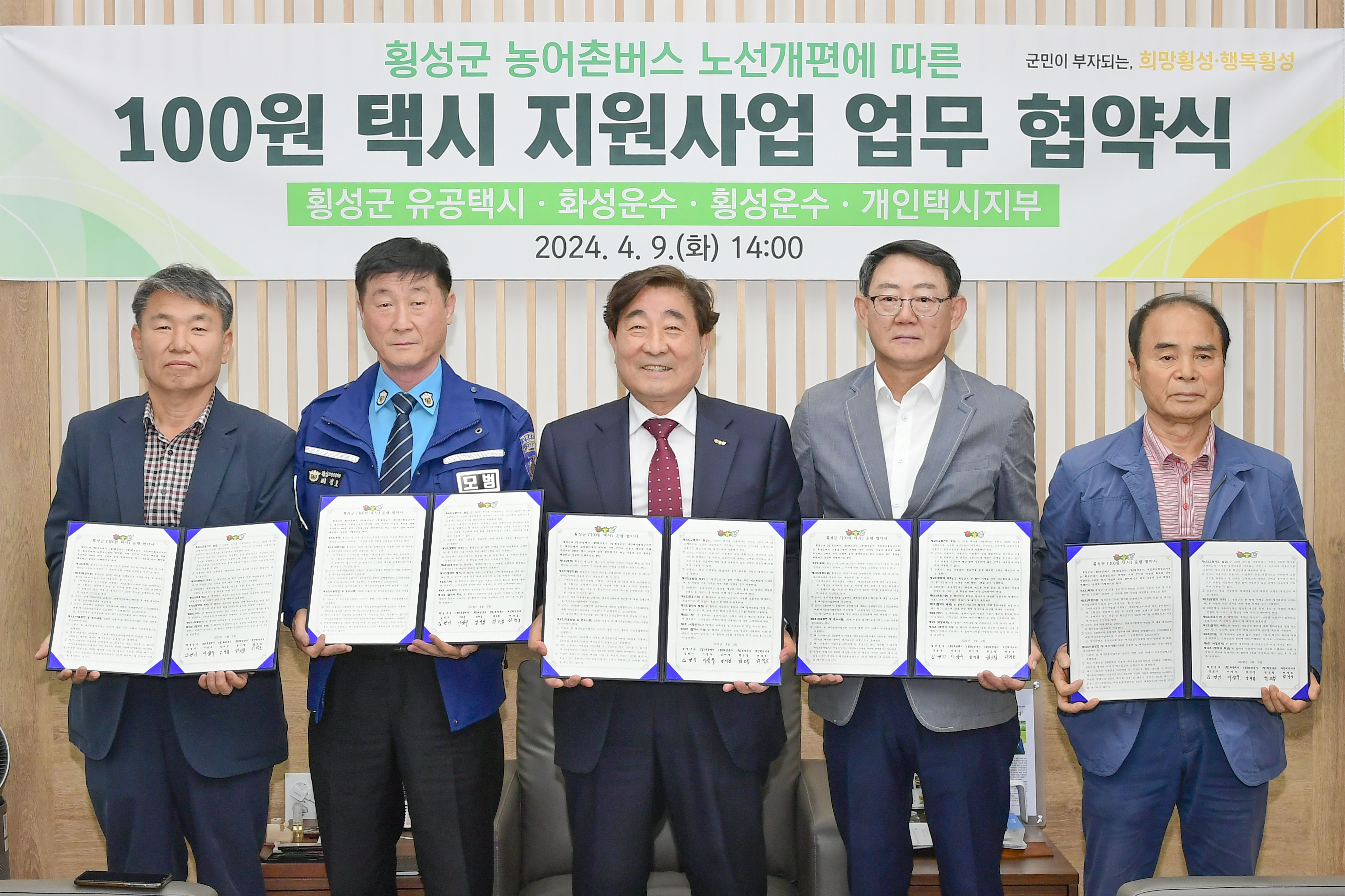 농어촌버스 개편에 따른 미운영 지역에 이동권 보장 5월 1일부터 시범운영, 8월 1일부터 전면 시행 예정 횡성군(군수 김명기)은 주민에게 혁신적이고 저렴한 대중교통 서비스를 제공하기 위해 4월 9일 군청에서 개인택시지부와 유공택시, 화성운수, 횡성운수와 100원 택시 서비스 업무협약을 진행했다. 100원 택시 사업은 횡...
