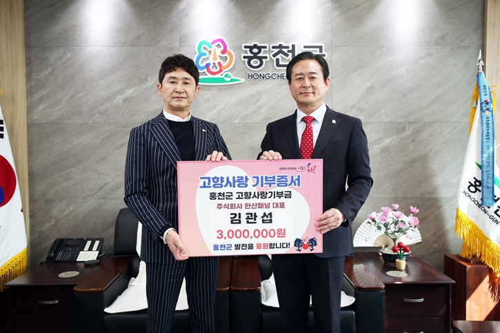 (주)한산패널 대표 김관섭은 지난 3월 15일 홍천군청을 방문해, 고향인 홍천군 발전을 위해 300만원을 기부하며, 고향사랑기부행렬에 동참했다.