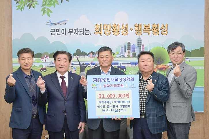 남산건설(주)(대표 김진섭)은 횡성의 미래 인재 육성에 이바지하기 위해 지난 3월 19일에 횡성군청을 방문하여 횡성인재육성장학회에 100만 원을 전달했다.