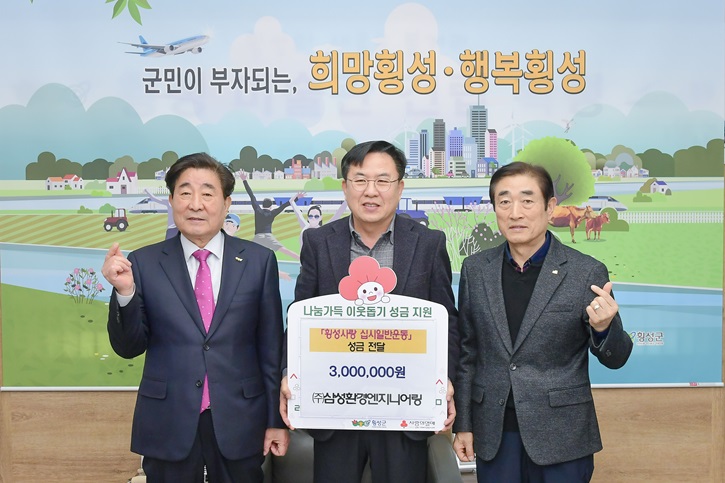 주식회사 삼성환경엔지니어링(대표 정호경)은 '횡성사랑 십시일반운동'에 동참하는 의미에서 지난 3월 5일 14시 20분에 횡성군청을 방문하여 성금 300만 원을 기부했다.