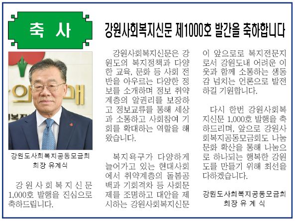 2023년 계묘년 새해를 맞이하여 강원사회복지신문 대표 최재석 2023년 계묘년 새해가 밝았습니다. 새해에도 모든 구독자 여러분들 가정에 건강과 행복이 늘 함께 하시길 기원합니다. 강원사회복지신문 대표에 취임한지 1년이 지났습니다. 그동안 저는 2022년 취임사에서 말했듯이 복지 사각지대을 찾는 신문! 소통의 장이 되...