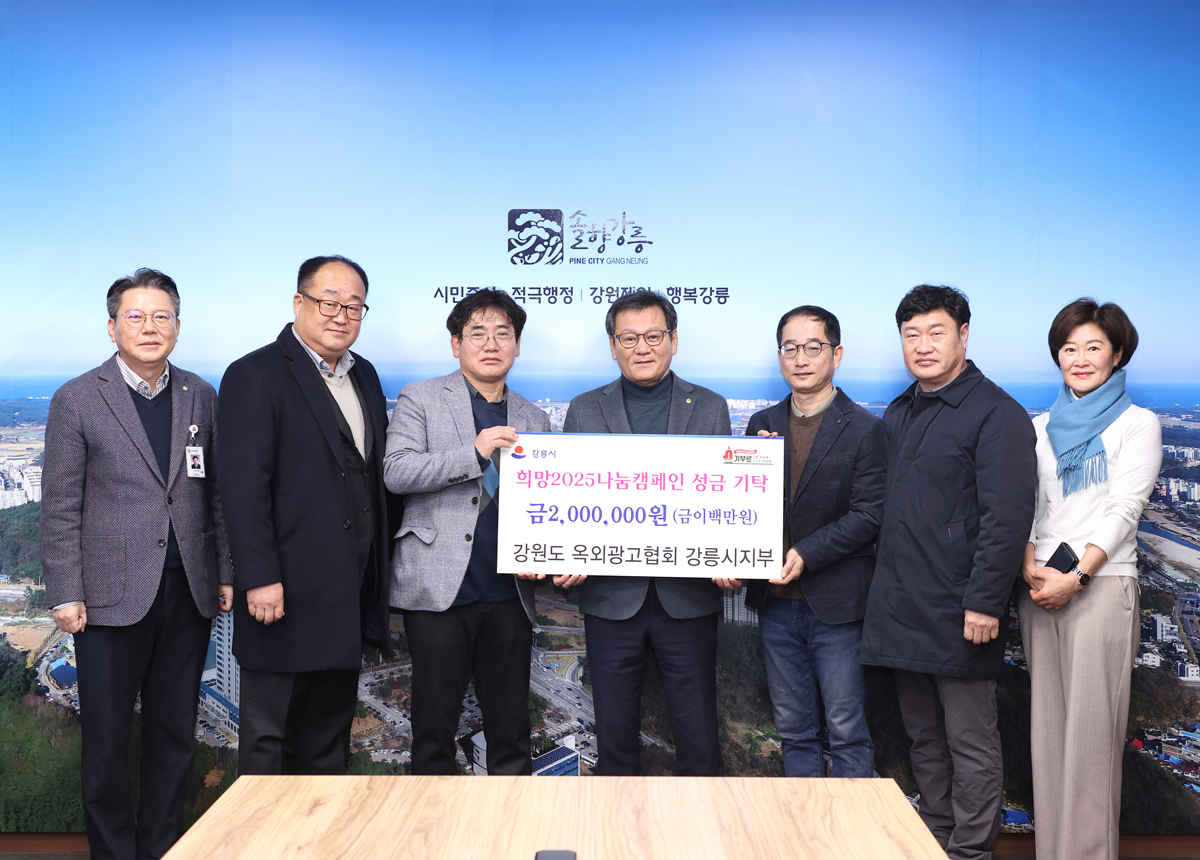 (사)강원특별자치도 옥외광고협회 강릉시지부(지부장 심정호)는 1월 16일 오전 강릉시청을 방문해 성금 200만원을 기탁했다.