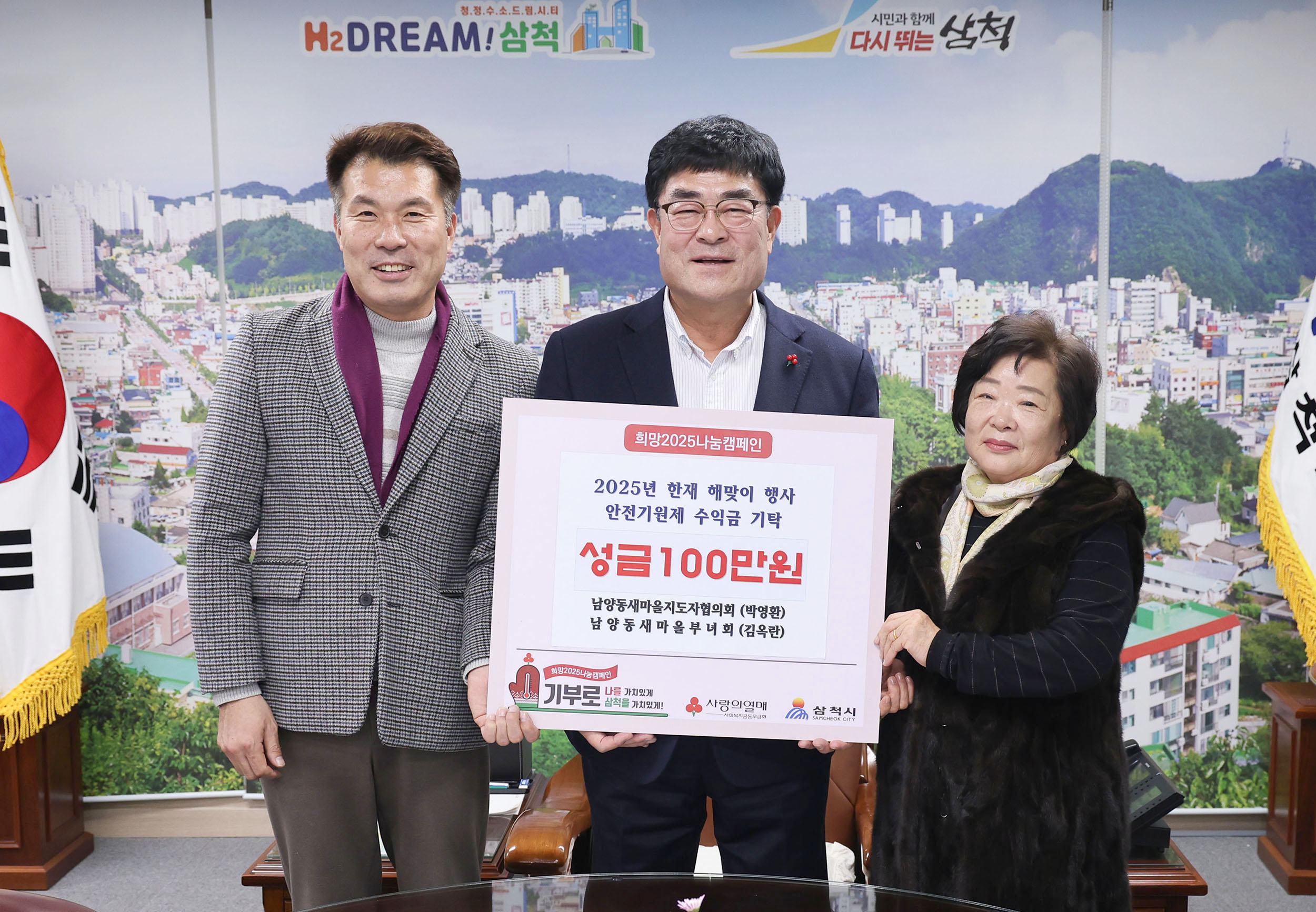 삼척시 남양동새마을지도자협회(회장 박영환)와 남양동새마을부녀회(회장 김옥란)가 지난 1월 14일, 2025년 한재 해맞이 행사의 안전기원제 수익금 100만 원을 남양동 취약계층이 따뜻하고 건강한 겨울을 나길 바라는 마음을 담아 이웃돕기 성금으로 기탁하였다. 남양동 새마을회는 매년 해맞이 행사 수익금을 이웃돕기 성금...