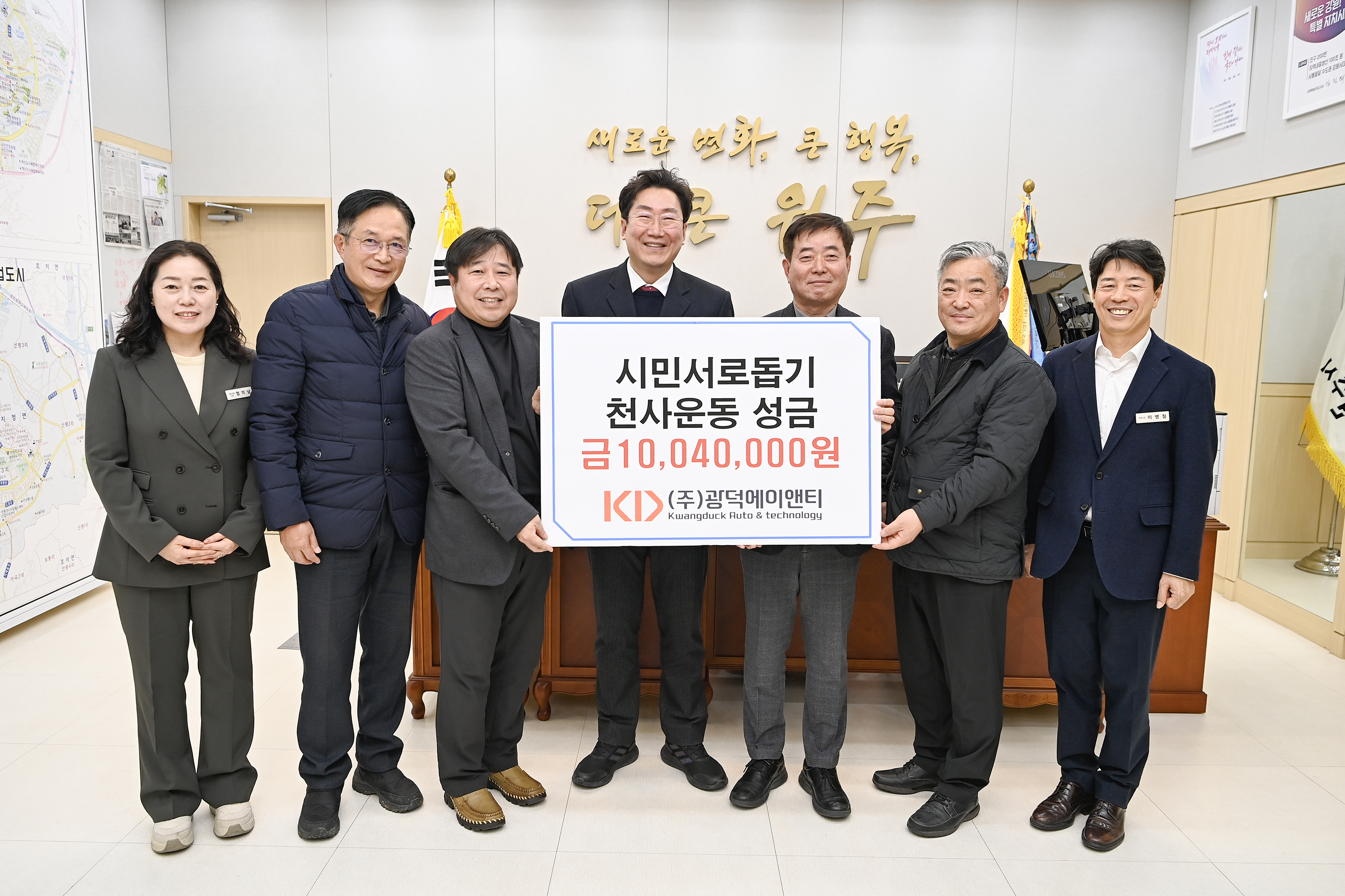 (주)광덕에이앤티(대표 김용백)는 12월 26일 오후 3시 원주시장 집무실에서 천사운동 후원금 1,004만 원(10,000계좌)을 기탁했다. 이날 전달식에는 원강수 원주시장을 비롯해 김용백 대표, 김명호 사장, 김봉중 부사장, 윤경준 이사가 참석했다. 후원금은 시민서로돕기 천사운동본부를 통해 차상위계층 370세대에 월 18만 원...