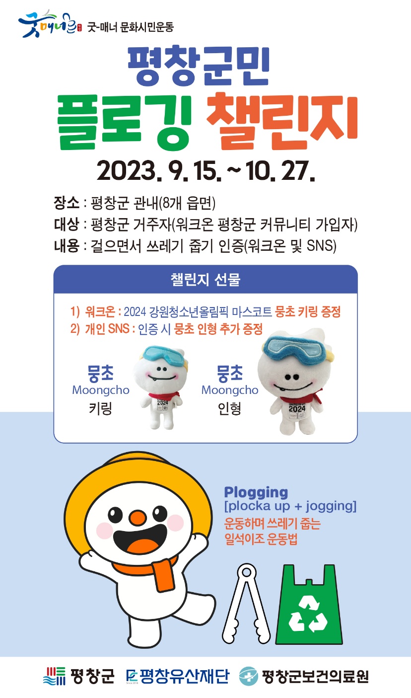 [강원사회복지신문 이정환 기자]=재단법인 평창유산재단(이사장 심재국)은 평창 굿-매너 시민운동 활성화와 2024 강원청소년동계올림픽 붐업 조성을 위한 2023 평창 군민 플로깅 챌린지(이하 '챌린지', 플로깅: 걸어다니며 쓰레기를 줍는 활동)를 진행한다고 밝혔다. 이번 챌린지는 워크온 앱(평창군 커뮤니티 가입)을 통해 ...