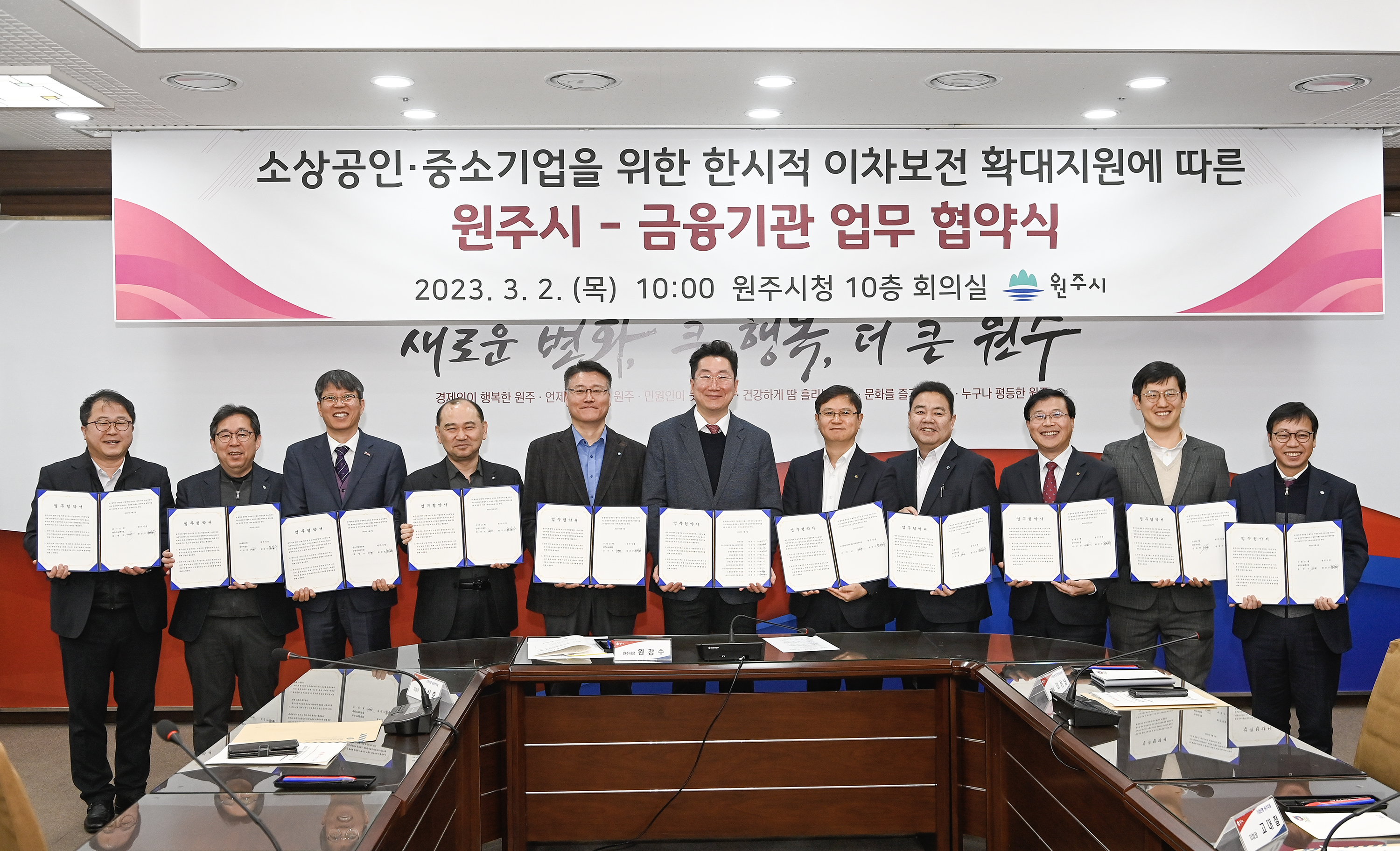 [강원사회복지신문 김도연 기자]=원주시 소상공인 경영안정자금 및 중소기업 육성자금 지원사업 협약 금융기관과 업무협약 체결 올해 2분기부터 예산 소진 시까지 지원 원주시는 지난 3월 2일 원주시청 10층 대회의실에서 한시적 이차보전 확대 지원을 위해 원주시 소상공인 경영안정자금 및 중소기업 육성자금 지원 사업 협...