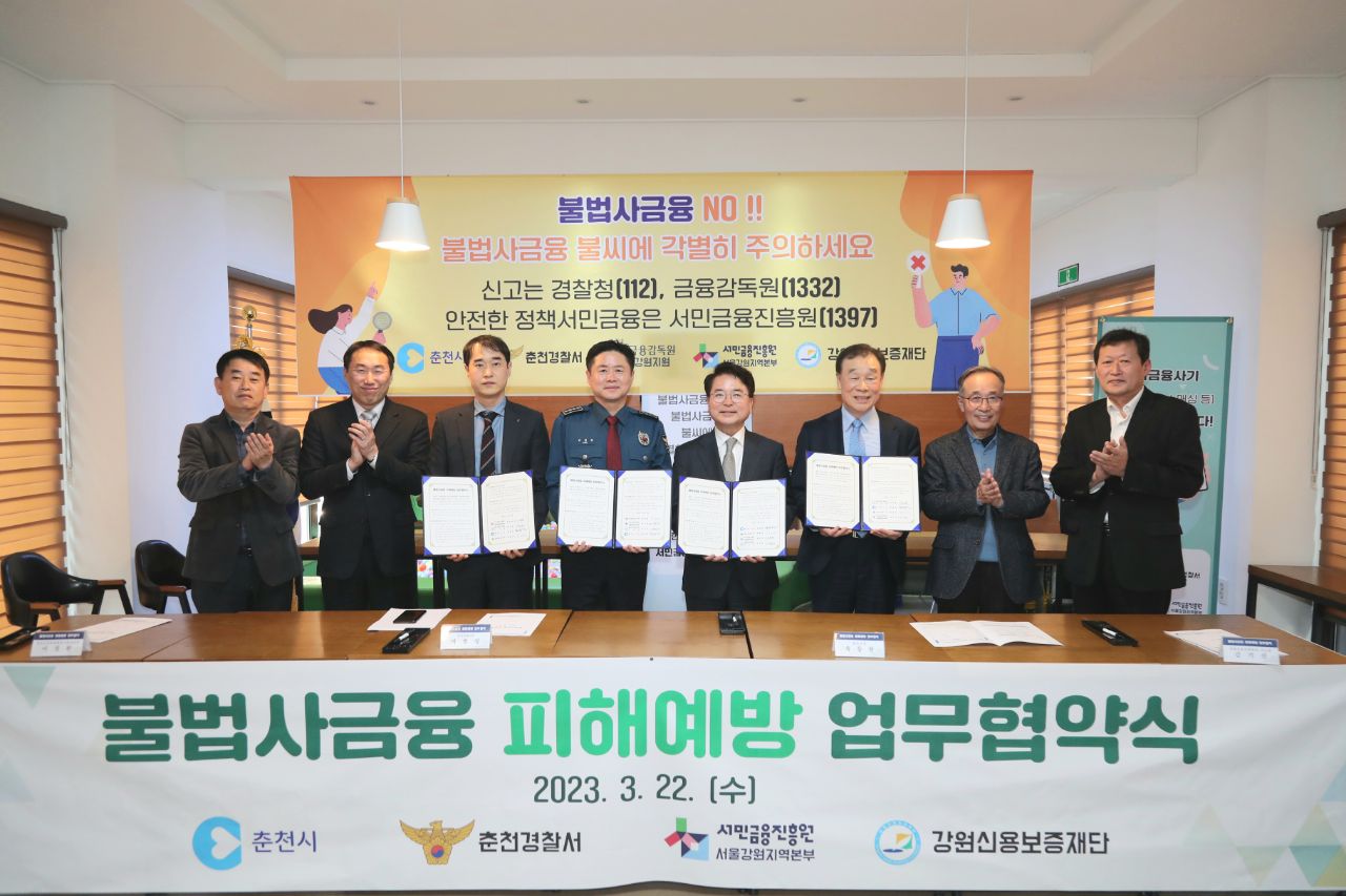 [강원사회복지신문 서은진 기자]=지난 3월 22일 춘천경찰서·서민금융진흥원 강원지역본부·강원신용보증재단 협약 불법사금융 피해 예방 및 캠페인 협력, 효과적인 대응 기대 춘천시가 서민을 울리는 불법사금융 범죄에 대응하기 위해 관련기관과 손을 맞잡는다. 시에 따르면 불법사금융 피해 예방 업무협약 및 캠페인이 지...