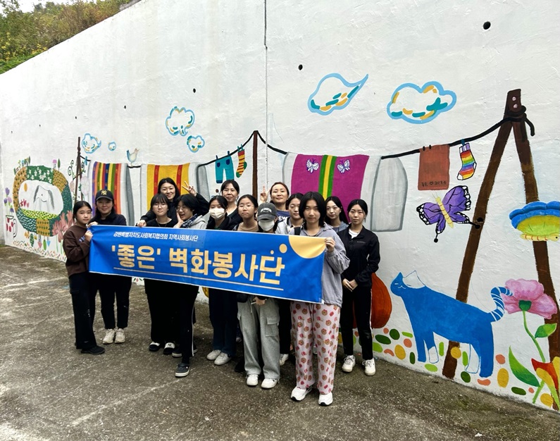 강원특별자치도사회복지협의회(회장 홍기종) 지역사회봉사단으로 활동 중인 ‘좋은’벽화봉사단(대표 왕미화)이 10월 27일(일) 오전 10시부터 오후 4시까지 춘천원광효도의집에서 벽화그리기 봉사활동을 실시하였다. 올해 두 번째로 진행한 ‘좋은’벽화봉사단의 이번 봉사활동은 많은 인원이 참여하는 만큼 한 달간 일정을 ...