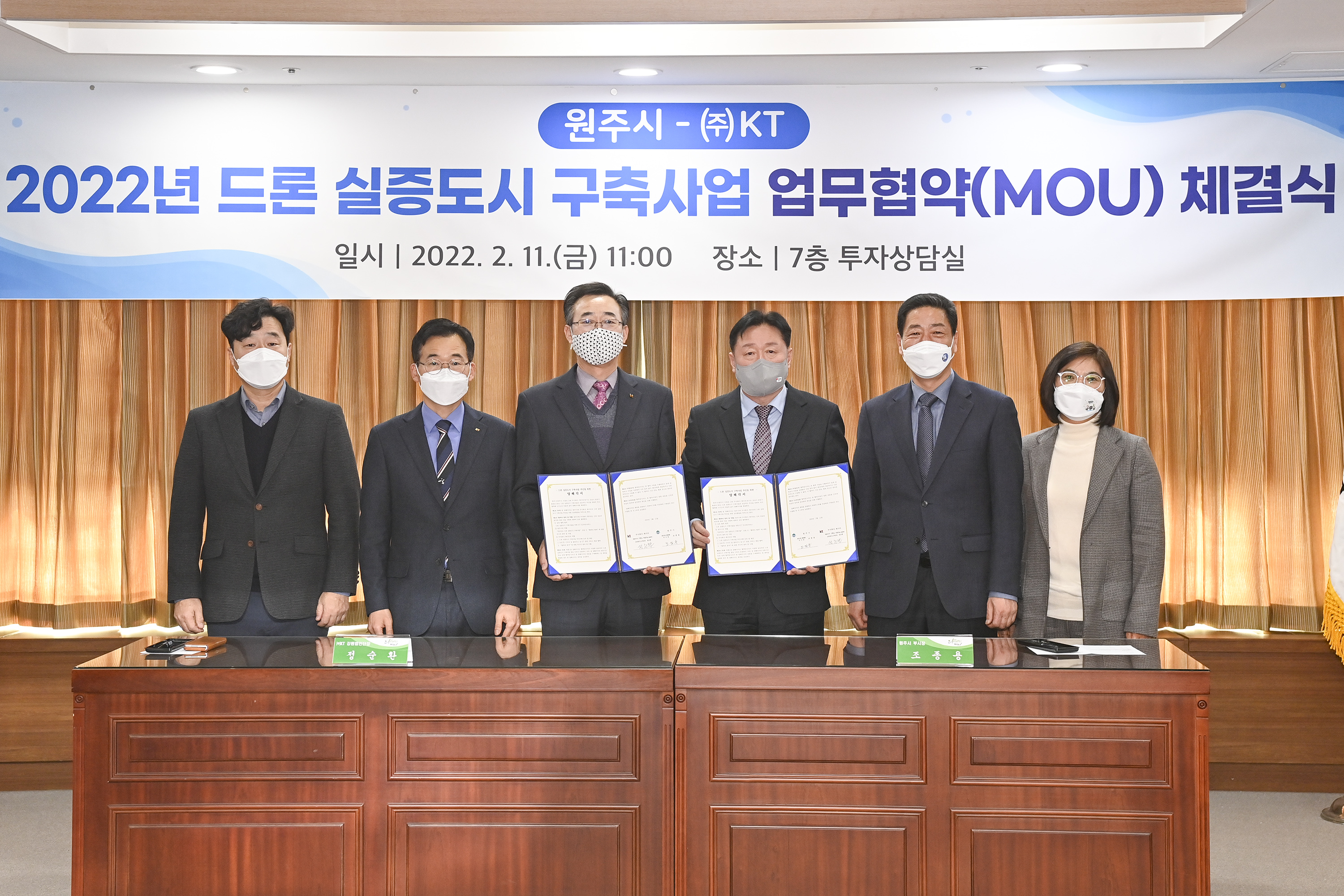 [강원사회복지신문 서은진 기자]=2월 11일 오전 11시, 원주시청 투자상담실에서 협약식 개최 4G·5G 상공 통신망 등 ICT 인프라 구축 및 서비스 제공을 위해 상호 협력 원주시와 KT는 지난 2월 11일 오전 11시 원주시청 투자상담실에서 드론 실증도시 구축을 위한 업무협약(MOU)을 체결했다. 이번 협약으로 KT는 원주시의 드...
