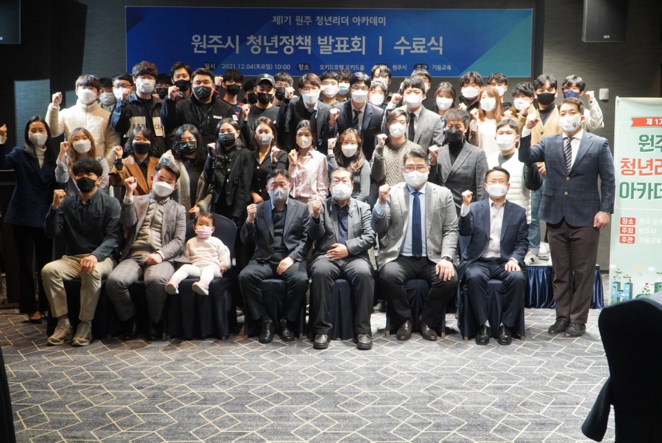 [강원사회복지신문 홍기한 기자]=분야별 정책제안 팀 발표 및 수료증 수여 6월부터 12월까지 월 1~2회, 총 10회 진행 원주시는 창조적인 청년리더 발굴과 역량 강화를 위한 '제1기 원주 청년리더 아카데미' 수료식을 지난 12월 4일 오키드 호텔에서 개최했다. 수료식에서는 6개 분야별로 팀을 이뤄 그동안 활동한 결과물인 정...