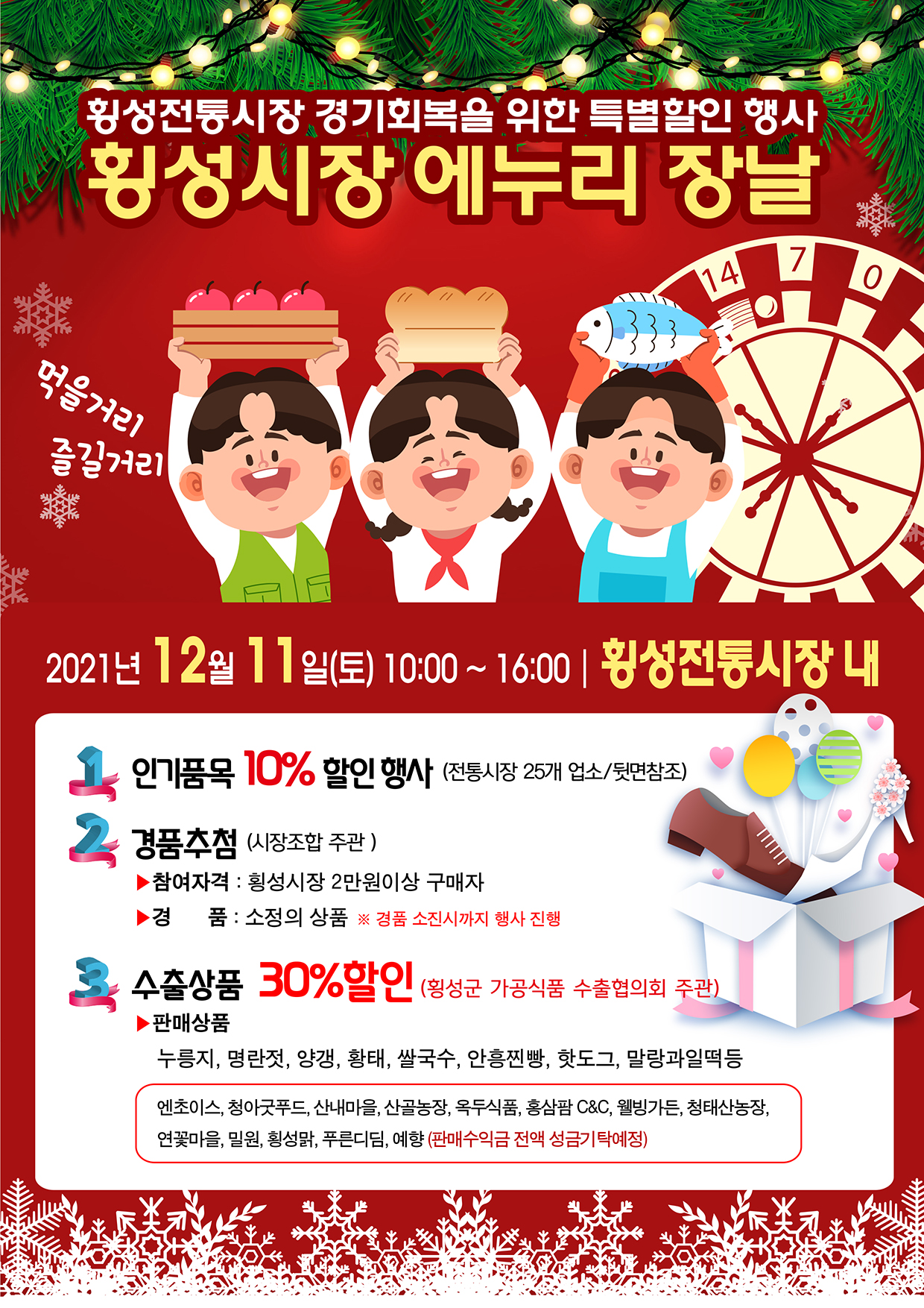 [강원사회복지신문 서은진 기자]=지난 12월 11일 횡성전통시장, 25개 업소 참여 횡성군가공식품수출협의회 13개 업체 동참, 수익금 전액 기탁 예정 횡성군은 코로나19 경기회복을 위해, 횡성시장에서 특색있고 다양한 제품을 시중보다 저렴한 가격으로 특별 할인 판매하는 '횡성시장 에누리 장날' 행사를 개최했다. 이번 행사...