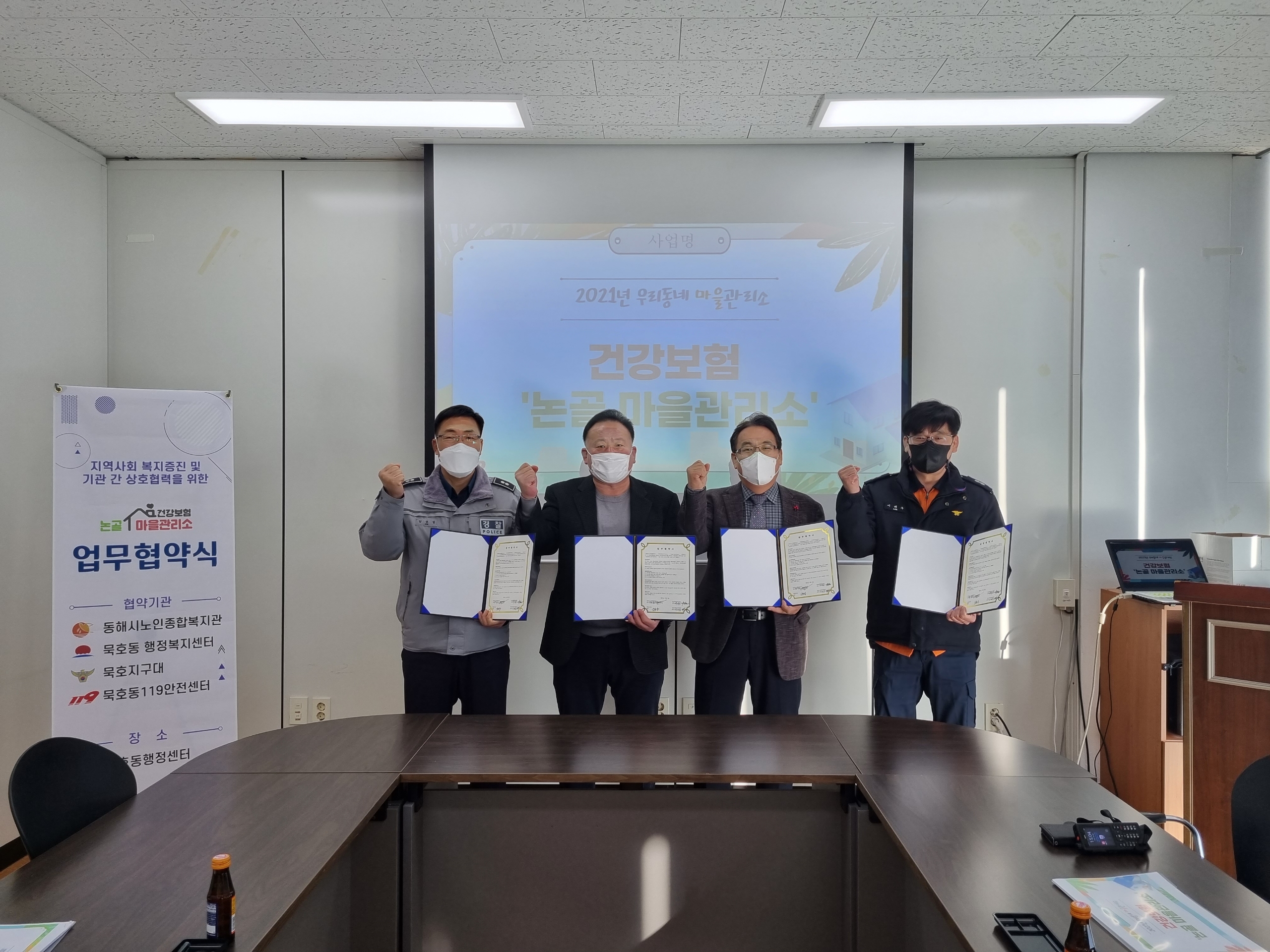 [강원사회복지신문 김종한 기자]=묵호동행정복지센터, 동해시노인종합복지관, 묵호동119안전센터, 묵호지구대 4개 기관 묵호동행정복지센터, 동해시노인종합복지관, 묵호동119안전센터, 묵호지구대는 지난 11월 12일 '건강보험-논골마을관리소'사업 지원에 관한 협약을 체결했다고 밝혔다. 이번 협약은 4개 기관 간 상호협력...