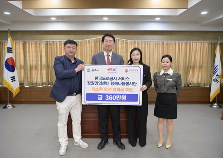 한국도로공사서비스 강원영업센터 행복나눔봉사단(대표 오병삼)은 지난 5월 3일 원주시청 투자상담실을 방문하여 저소득층 학생을 위한 장학금을 360만 원을 기탁하였다. 이번 후원금은 관내 아동·청소년 가구에 월 20만씩 9개월간 정기후원금이 지급되며, 총 2가구를 지원한다. 한국도로공사서비스는 통행료, 콜센터 및 교...