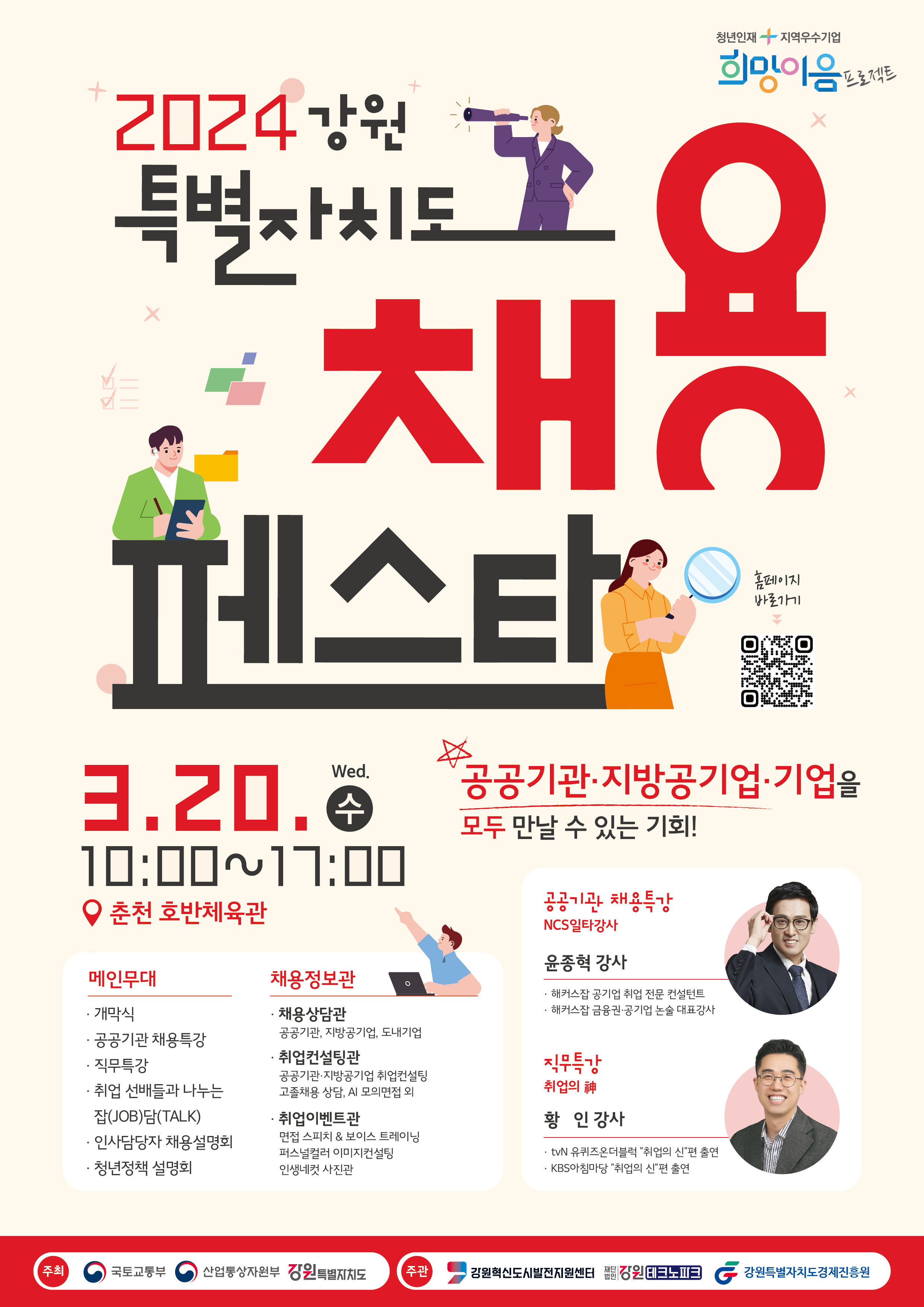국토교통부·산업통상자원부·강원특별자치도에서는 강원지역 구직자(지역인재) 채용 기회를 확대하고자 ‘2024 강원특별자치도 지역인재 채용 페스타’ 행사를 3월 20일(수) 춘천 호반체육관에서 개최한다. 이번 프로그램은 공공기관 인사담당자 채용설명회, 공공기관 신입사원 토크 콘서트, 공공기관 채용 특강, 기관(기업...