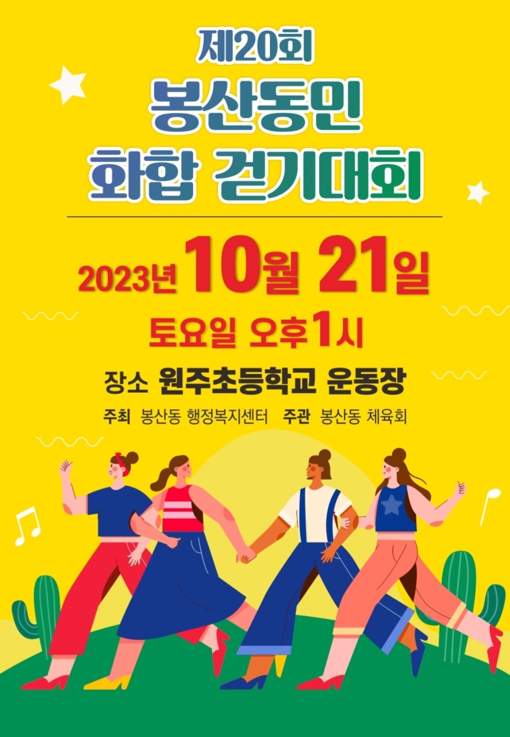 [강원사회복지신문 홍기한 기자]=왕복 4km 걷기대회 진행, 참여자에게 행운권 추첨 통해 다양한 경품 제공 원주시 봉산동 체육회(회장 박한상)는 오는 10월 21일(토) 원주초등학교 운동장에서 제20회 봉산동민 화합 걷기대회를 개최한다. 올해로 20회째를 맞이하는 이번 행사는 주민들의 건강증진과 화합을 도모하고자 마련됐...