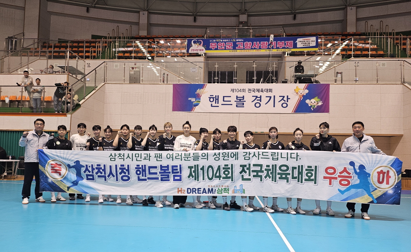 제104회 전국체육대회에 여자일반부 강원특별자치도 대표로 참가해 우승 삼척시청 핸드볼팀이 '제104회 전국체육대회'에 여자일반부 강원특별자치도 대표로 참가하여 우승을 차지했다. 지난 10월 19일(목) 전남 무안종합스포츠파크에서 열린 결승전에서 삼척시청 핸드볼팀은 경기도 대표 SK 슈가글라이더즈를 28대 26으로 이...