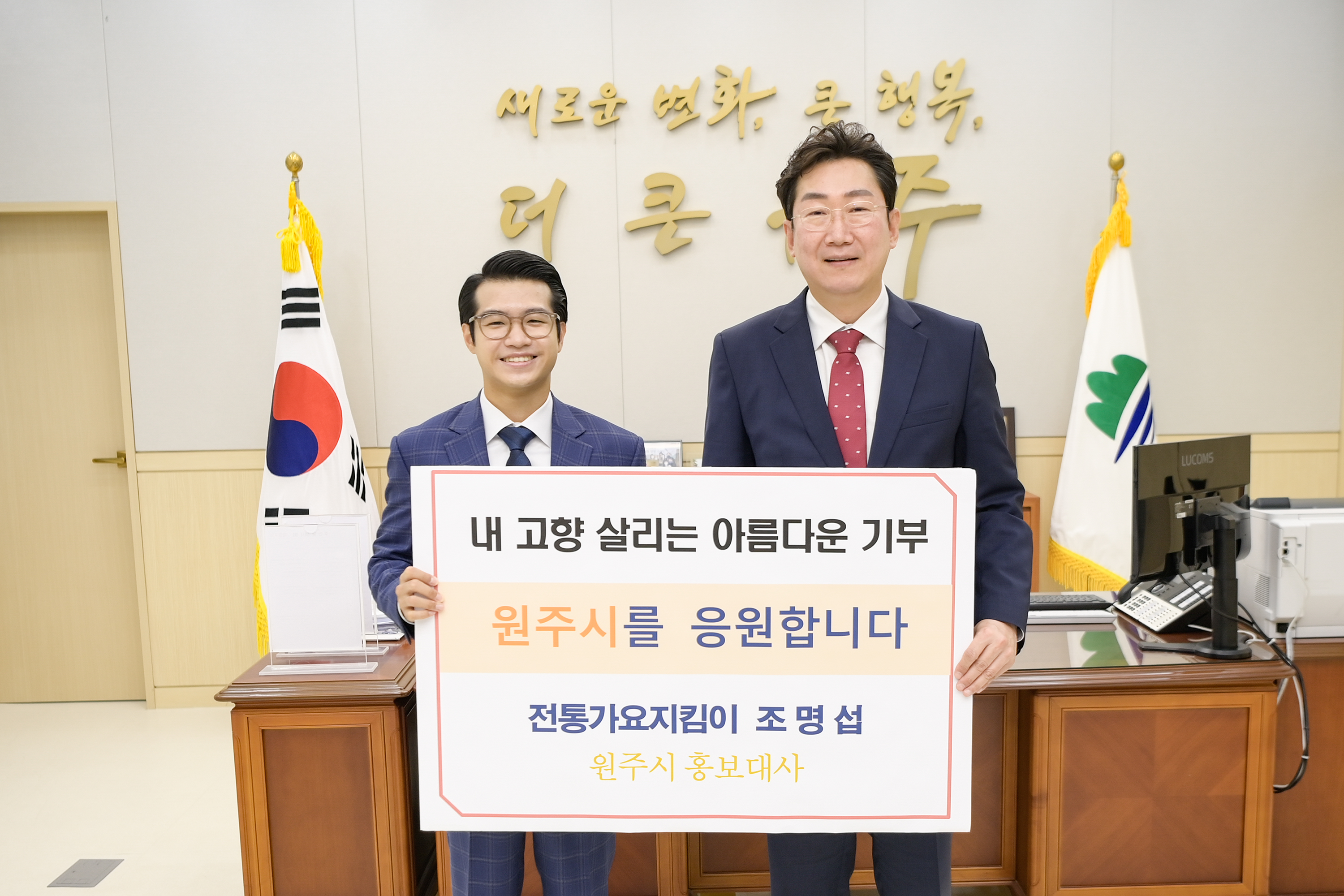 [강원사회복지신문 홍기한 기자]=원주시 홍보대사이자 전통가요지킴이 조명섭은 지난 9월 26일 고액 기부자로 나서, 원주시청을 방문하여 고향사랑기부금을 쾌척하였다. 조명섭은 원주시 행사뿐만 아니라 전국 공연을 돌며 원주시 홍보대사로서 원주시 알리기에도 앞장서고 있다.