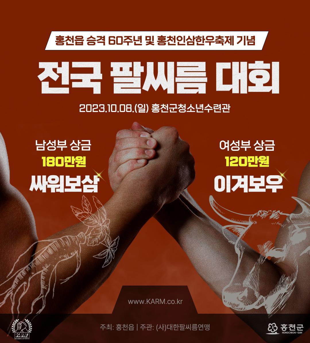 [강원사회복지신문 김도연 기자]=유명 팔씨름 선수와의 겨루기 등 다양한 행사 이벤트도 열려 홍천읍행정복지센터(읍장 심금화)는 홍천읍 승격 60주년을 기념하고 홍천 인삼한우 명품축제의 성공적 개최를 위하여, 다음달 8일 홍천군 청소년수련관에서 전국팔씨름대회를 개최한다고 밝혔다. 이번에 개최되는 '홍천읍 승격 60...