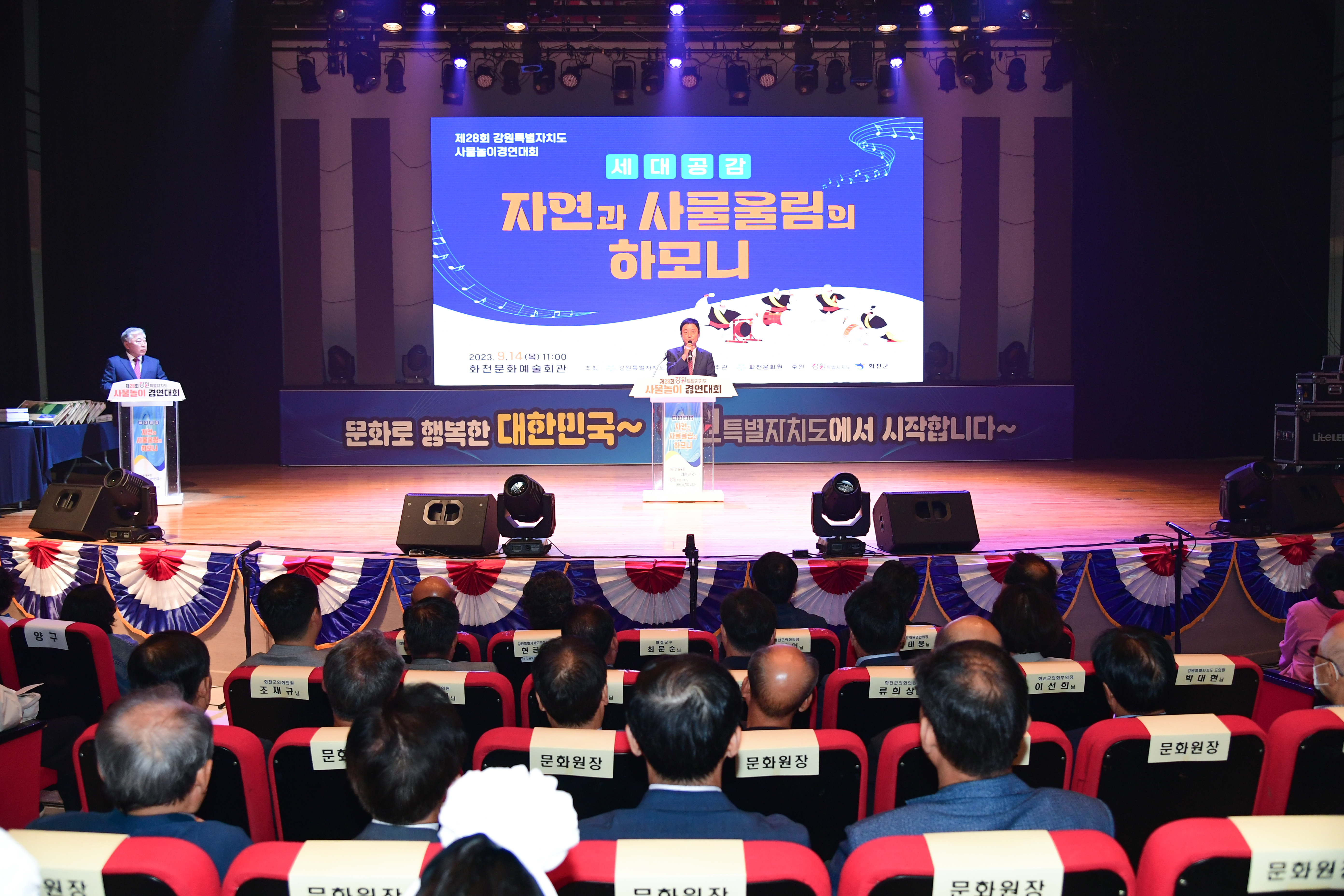[강원사회복지신문 홍기한 기자]=제28회 강원특별자치도 사물놀이 경연대회가 지난 9월 14일 화천문화예술회관에서 최문순 군수를 비롯해 도내 참가자 400여 명이 참석한 가운데 열렸다.