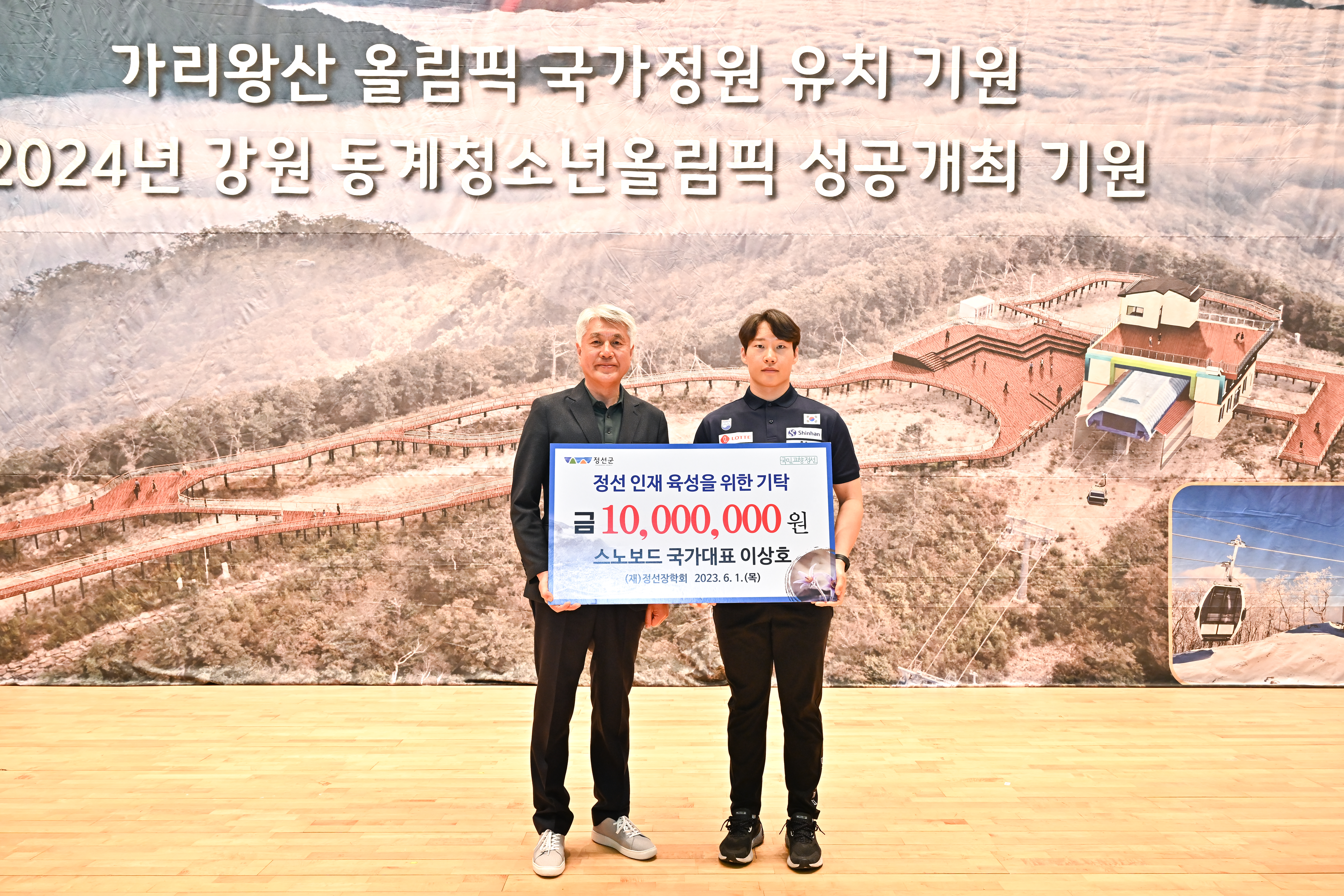 [강원사회복지신문 이정환 기자]=정선 출신 스노우보더이자 2018 평창동계올림픽 은메달리스트 이상호 선수가 지난 6월 1일 정선종합경기장 일원에서 열린 '제41회 정선군민의 날 기념 군민체육대회 개막식'에서 지역 인재 육성을 위해 써 달라며 정선장학회(이사장:최승준)에 장학금 1,000만원을 기탁했다.