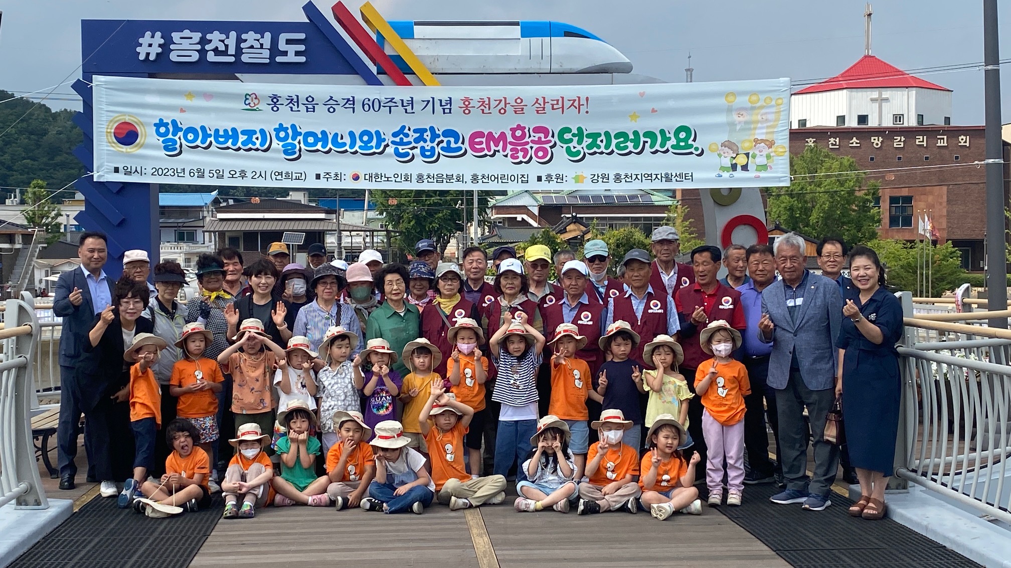 [강원사회복지신문 홍기한 기자]=(사)대한노인회 홍천읍 분회(회장 현종길)에서는 지난 6월 5일 세계환경의 날을 맞아 경로당 회장 어르신들과 홍천어린이집 원생40명과 함께 '내고장 홍천강은 우리가 살린다'라는 구호 아래 홍천강 EM흙공 던지기 행사를 실시했다. 이날 행사에는 이형주 대한노인회 홍천군지회장, 최이경군...