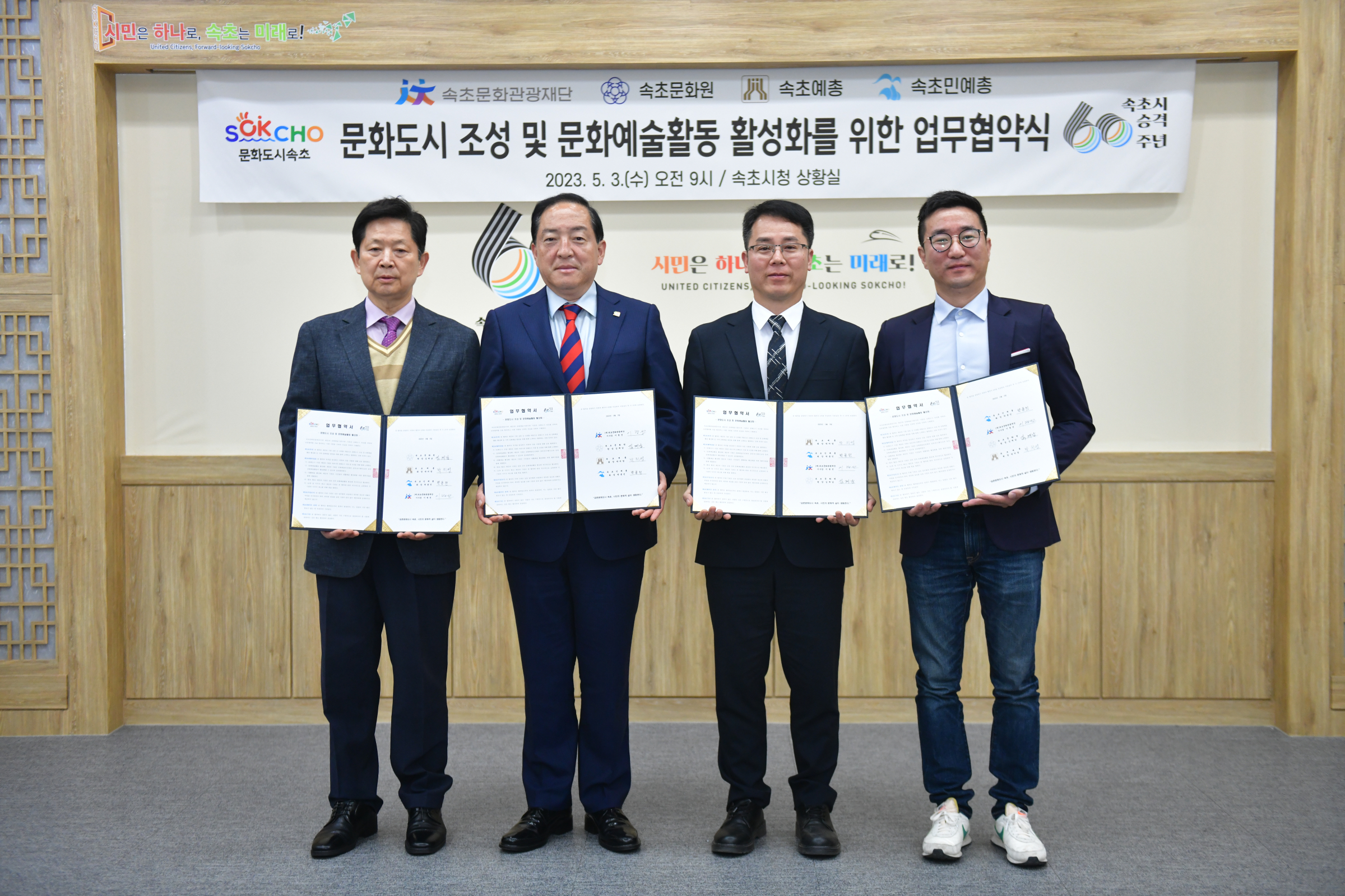 [강원사회복지신문 김종한 기자]=문화예술단체 협업을 통한 문화도시 조성 및 문화예술활동 활성화 기대 (재)속초문화관광재단(이사장 : 이병선 속초시장)은 문화도시 조성 및 문화예술활동 활성화를 위하여 지역 내 문화예술단체와 지난 5월 3일(수) 업무협약을 체결했다. 협약에 참여한 속초문화관광재단, 속초문화원, 속초...
