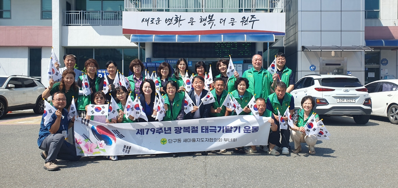 원주시 단구동 새마을회(지도자협의회장 임형곤, 부녀회장 우명옥)는 제79회 광복절을 하루 앞둔 지난 8월 14일 차량용 태극기 나눔을 실시했다. 단구동 새마을회원 약 20명은 단구동 일원에서 차량용 태극기를 나누며 ‘국권 회복을 경축하고 순국선열의 숭고한 뜻과 나라 사랑의 정신을 기리는 뜻깊은 행사’를 진행했다. ...