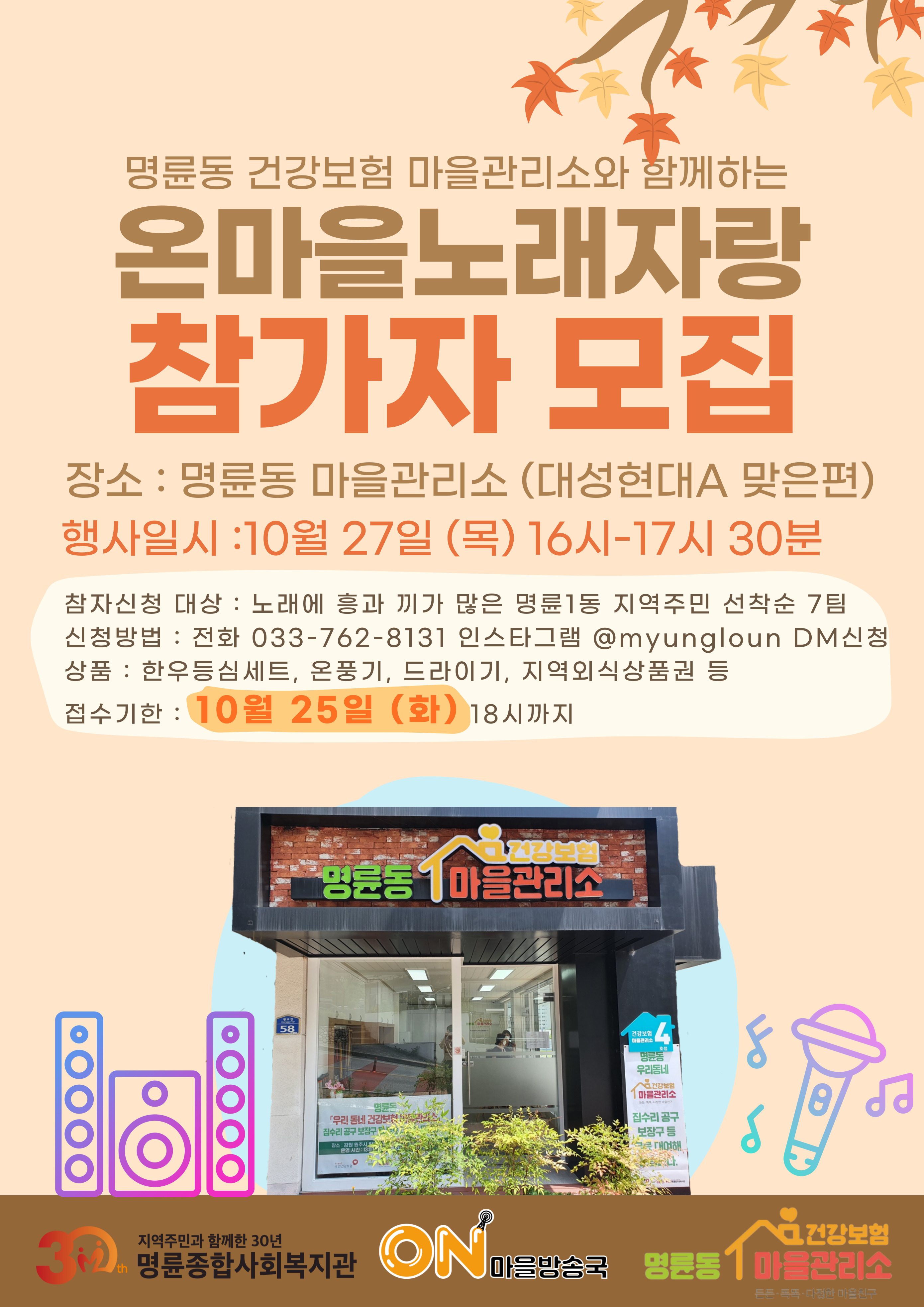 [강원사회복지신문 이정환 기자]=원주시 명륜종합사회복지관은 명륜동 건강보험 마을관리소와 함께하는 온마을노래자랑을 개최한다. 본 행사는 10월 27일(목) 16시부터 17시 30분까지 진행되며 명륜1동마을주민을 대상으로 진행된다. 이에 오는 10월 25일까지 참가자 모집을 접수받고 있다. 온마을노래자랑은 지역주민간의 소...