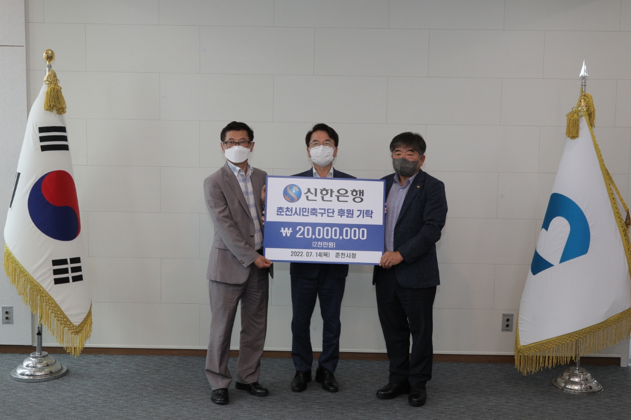 [강원사회복지신문 이정환 기자]=신한은행 강원본부(본부장:구춘서)는 지난 7월 14일 춘천시청 접견실에서 춘천시민축구단 후원금 2,000만원을 전달했다.
