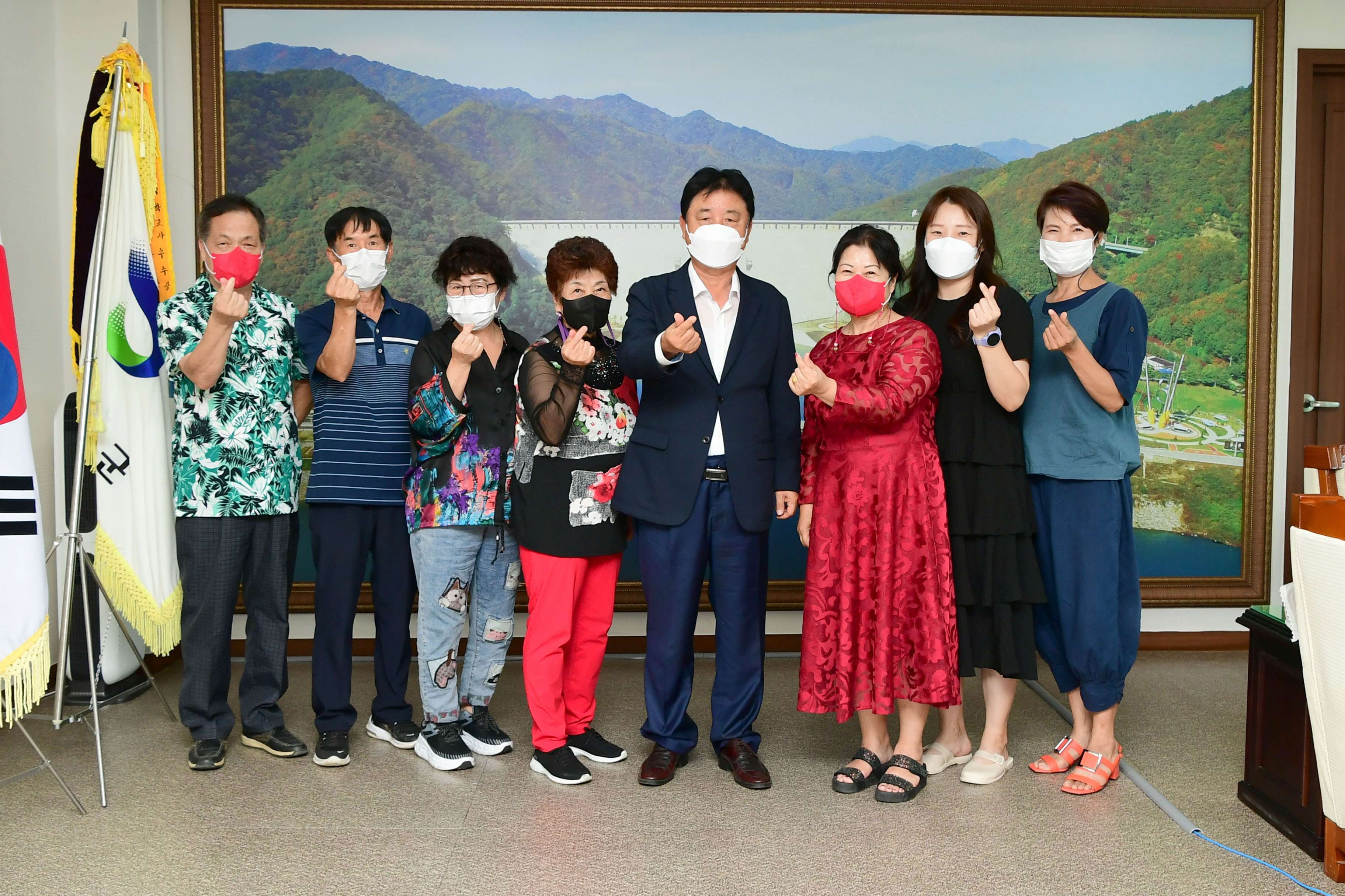 [강원사회복지신문 서은진 기자]=한국기로미술협회 화천군지회 왕정애 지회장(사진 오른쪽에서 세 번째)을 비롯한 지회 초대작가와 추천작가들은 지난 7월 18일 오후 최문순 화천군수를 방문해 그간 민화 발전과 후학양성을 위한 관심과 지원에 감사의 뜻을 전하며 간담회를 가졌다.