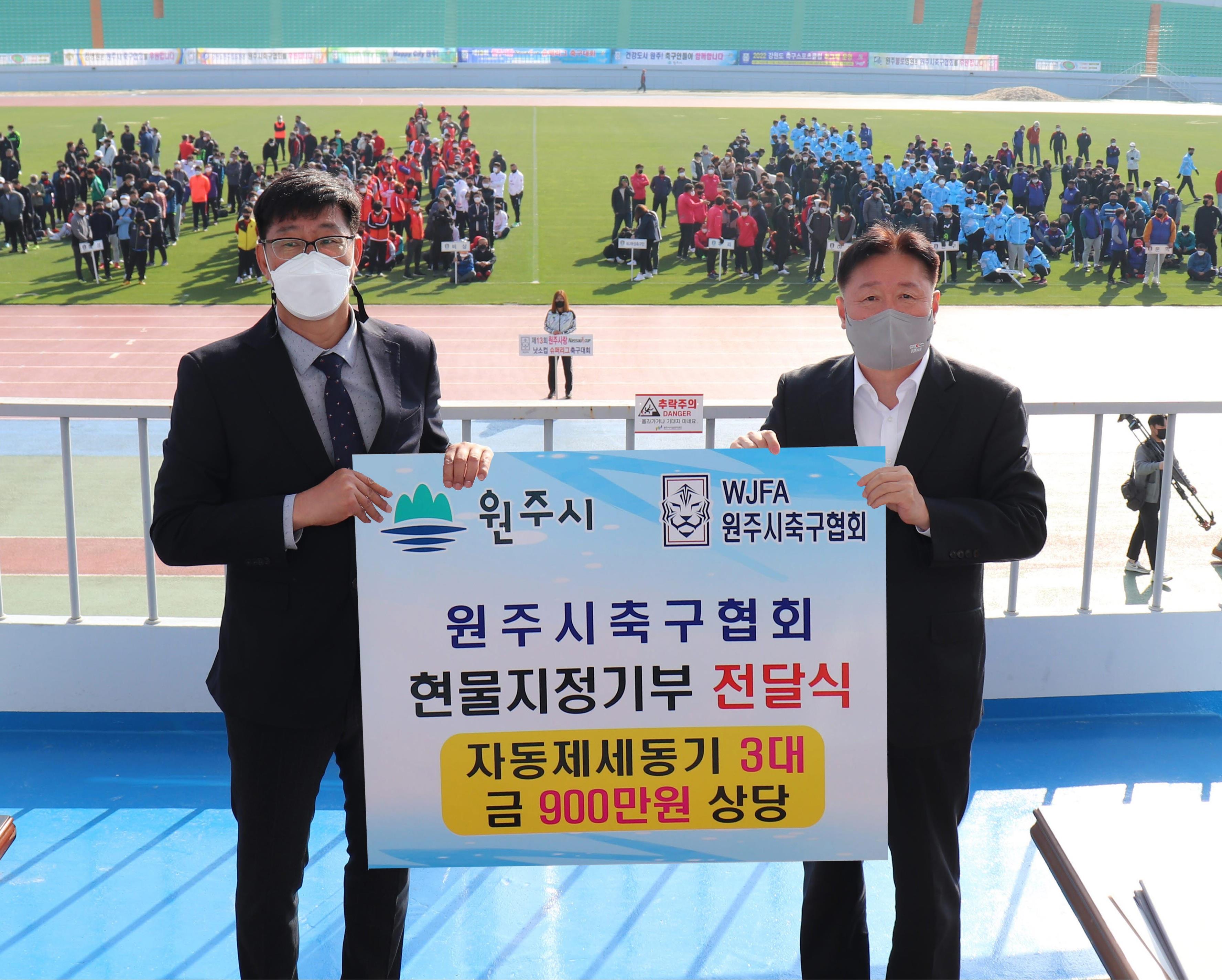 [강원사회복지신문 홍기한 기자]=원주시축구협회(회장 최병준)는 지난 4월 17일 원주종합운동장에서 열린 제13회 원주사랑 낫소컵 슈퍼리그 축구대회 개회식에서 자동심장충격기(AED) 3대를 원주시에 기부했다. 자동심장충격기는 혁신도시 체육공원 축구장과 환경체육단지 축구장, 문막생활체육시설 축구장에 각각 설치돼 운...