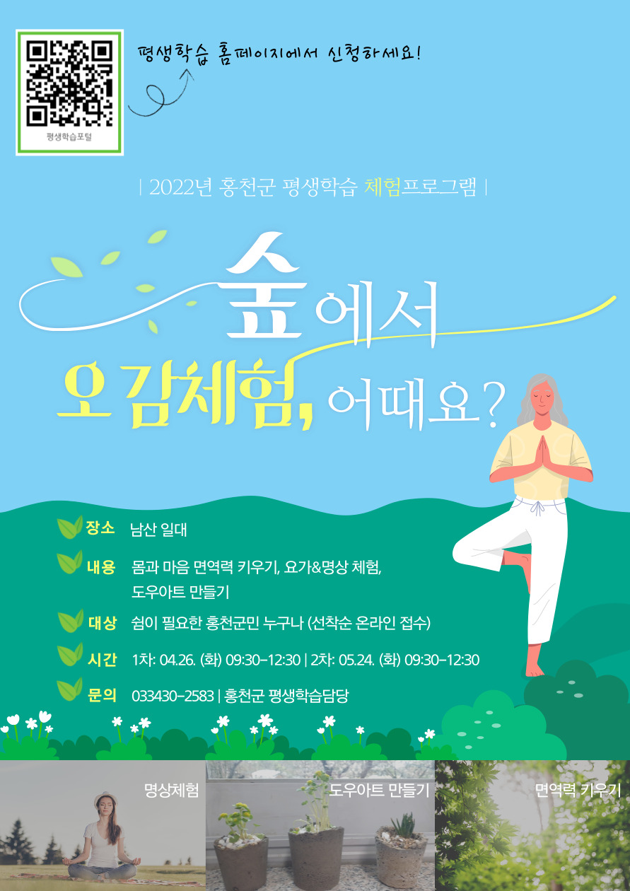 [강원사회복지신문 홍기한 기자]=4월 26일과 5월 24일, 15명씩 2차례에 걸쳐 체험프로그램 진행 몸과 마음 면역력 키우기, 요가&명상 체험, 도우아트 만들기 프로그램 운영 홍천군이 남산에서 진행되는 자연을 활용한 오감체험에 참여할 평생학습 체험프로그램 학습자 30명을 선착순 모집한다. 홍천군민이면 누구나 참여...