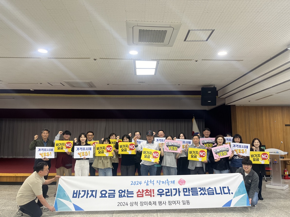 ‘바가지요금’ 근절을 위한 교육 진행 삼척시는 지난 5월 13일 삼척시청 대회의실에서 ‘2024 삼척 장미축제’ 부스 및 푸드트럭 운영자, 30여 명을 대상으로 행사 진행에 관한 내용을 최종 브리핑하는 것과 동시에 ‘바가지요금’ 근절을 위한 교육을 진행했다. 참가자들은 ‘바가지요금’ 근절을 위한 교육을 수강하고, 관...