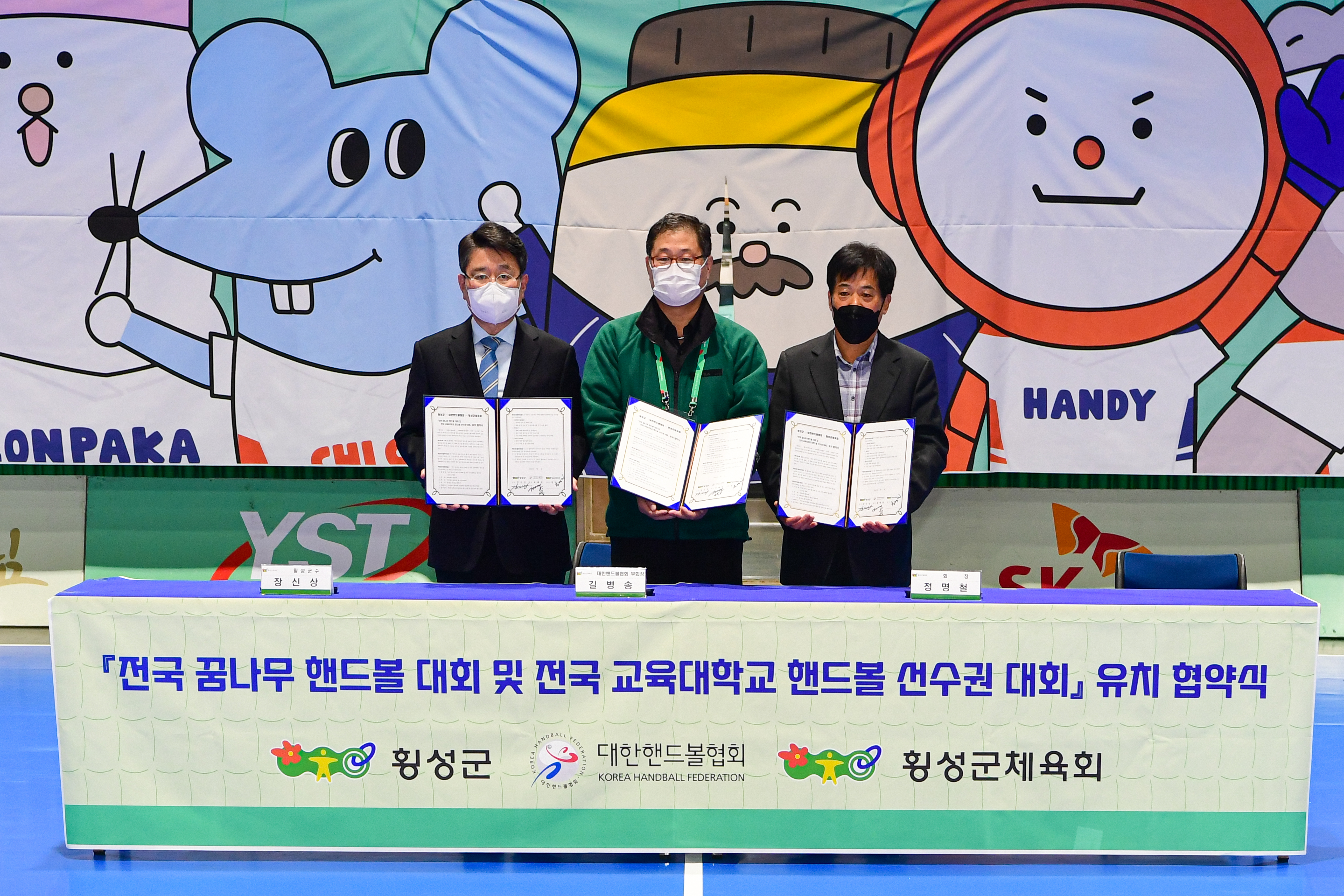 [강원사회복지신문 홍기한 기자]=횡성군과 횡성군체육회는 지난 3월 14일 오후 2시, 횡성실내체육관에서 대한핸드볼협회와 전국 꿈나무 핸드볼대회 및 전국 교대 핸드볼선수권대회 협약식을 개최했다. 장신상 군수, 정명철 군 체육회장, 대한핸드볼협회 김진수 부회장, 정규오 사무처장, 김용진 수석위원 등이 참석한 이번 협...