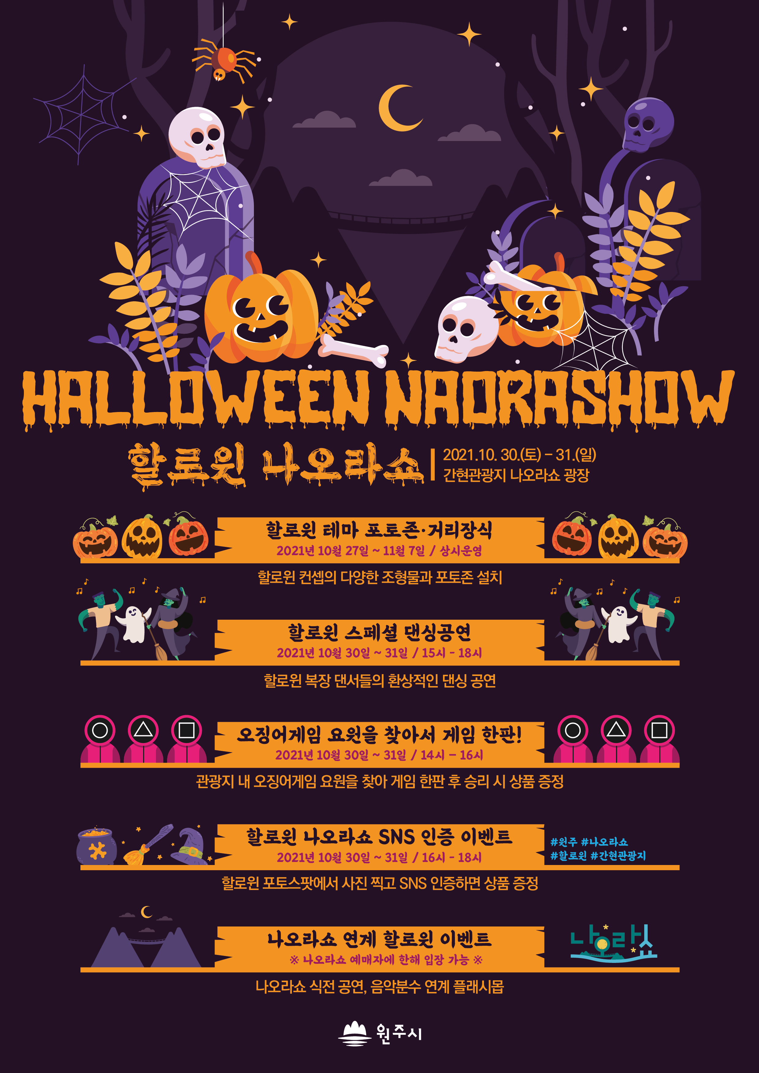 [강원사회복지신문 홍기한 기자]=10월 28일~11월 7일 테마 포토존·거리장식 운영 10월 30일~31일 공연·게임·SNS 인증 등 특별이벤트 진행 소금산 출렁다리에 이어 나오라쇼 개장으로 원주 관광의 중심으로 자리 잡은 간현관광지에서 할로윈데이를 맞아 또 하나의 이색 볼거리인 '할로윈 나오라쇼'가 화려하게 펼쳐진다. 오...