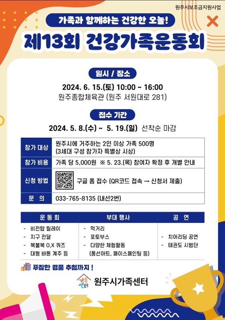 참가신청: 5월 8일(수)~5월 19일(일) 6월 15일(토) 10:00 ~ 16:00 / 원주종합체육관 원주시와 원주시가족센터(센터장 남궁은임)는 ‘제13회 건강가족운동회’에 참가할 가족을 모집한다. ‘제13회 건강가족운동회’는 6월 15일(토) 10시 원주종합체육관에서 개최한다. 5월 8일(수)부터 5월 19일(일)까지 원주시에 거주하는 2...