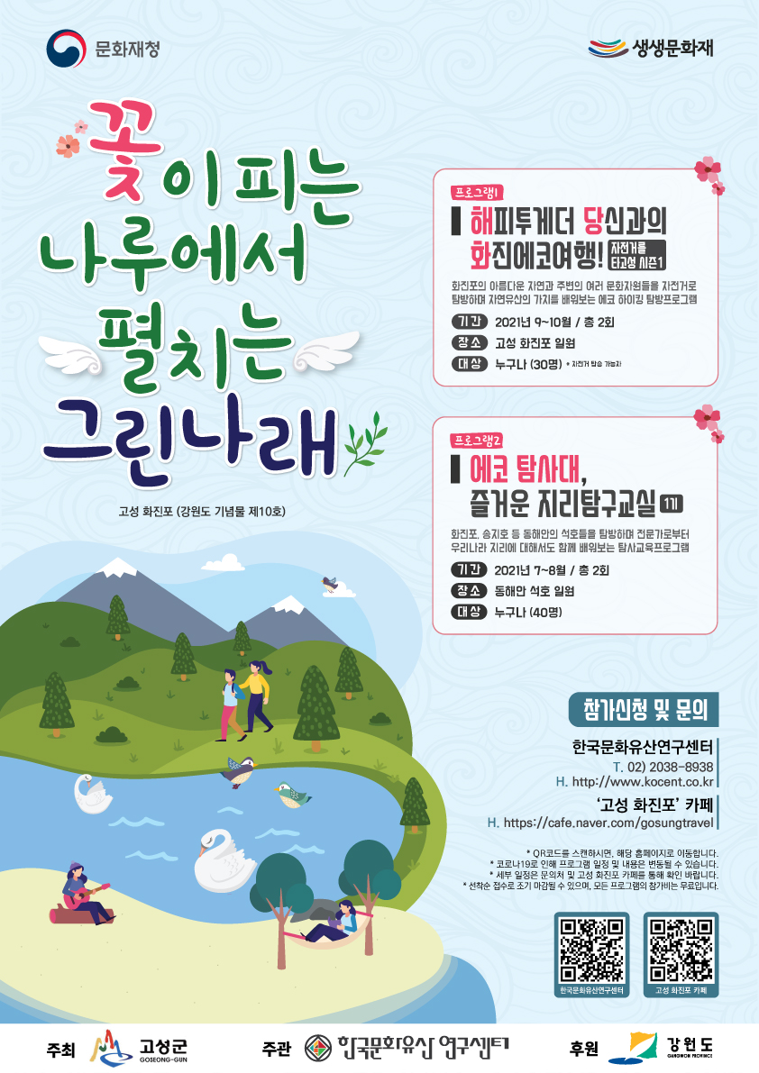 [강원사회복지신문 이정환 기자]=강원도 고성군(군수 함명준)은 올해 10월까지 고성군 문화재인 화진포(도 기념물 제10호)를 대상으로 한 '2021 고성군 생생문화재 활용사업'의 일환으로 '꽃이 피는 나루에서 펼치는 그린나래!'를 진행한다고 밝혔다. '꽃이 피는 나루에서 펼치는 그린나래!'는 강원도 고성군이 주최하고 한국...