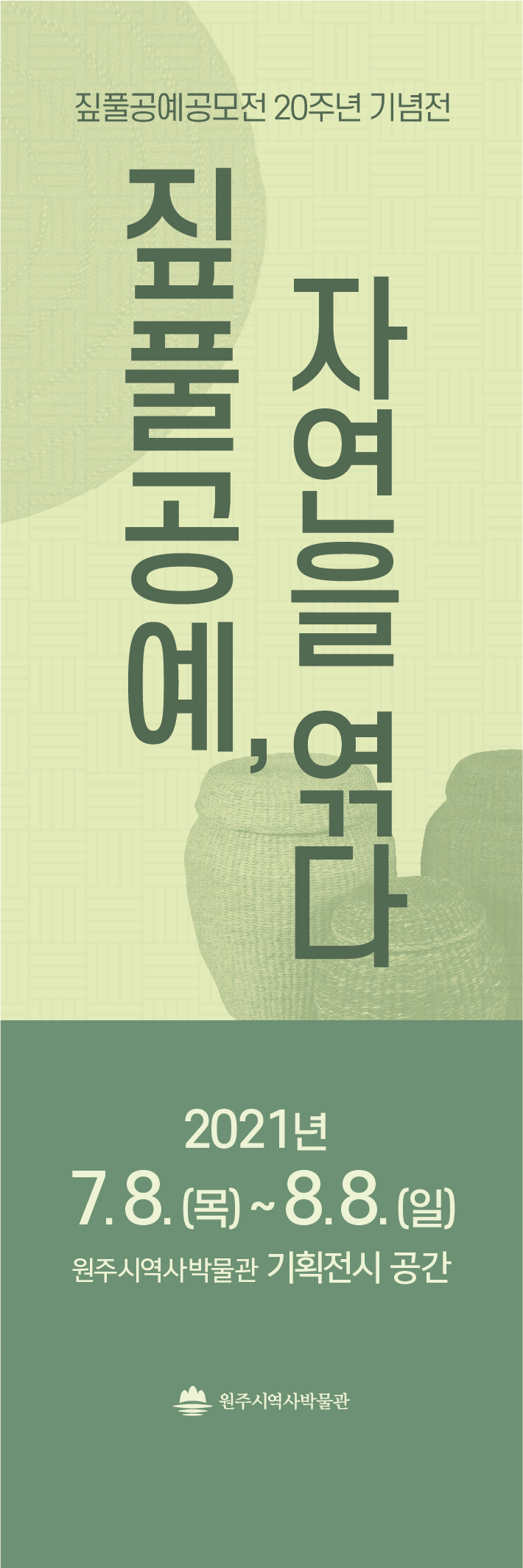 [강원사회복지신문 서은진 기자]=7월 8일부터 8월 8일까지 원주시 역사박물관 짚풀공예공모전 20년의 역사, 부문별 수상작 50여 점 전시 원주시 역사박물관(관장 김흥배)은 7월 8일부터 8월 8일까지 짚풀공예공모전 20주년 기념전 '짚풀공예, 자연을 엮다'를 개최한다. 이번 전시에서는 지난 2002년 시작된 짚풀공예공모전의...