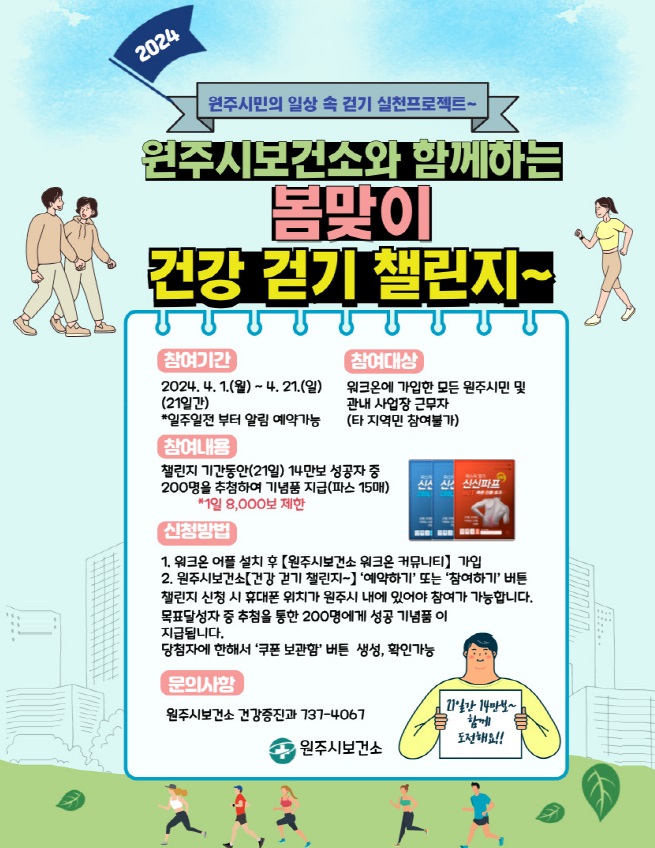 4월 1일부터 21일까지 21일간 14만보 걷기 원주시보건소는 시민의 ‘일상생활 속 걷기 습관 생활화’ 동기부여를 위해 4월부터 원주시보건소와 함께하는 ‘봄맞이 건강 걷기 챌린지’를 운영한다. 건강 걷기 챌린지는 스마트폰의 워크온(Walkon) 앱을 활용해 실시간으로 자신의 걸음 수를 측정하며 일상 속 걷기 운동을 재미...