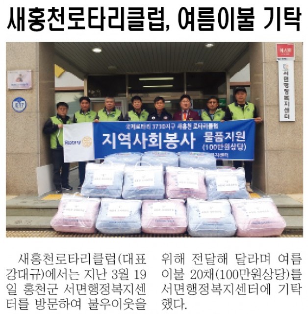 로타리클럽 소식-새홍천로타리클럽, 여름이불 기탁