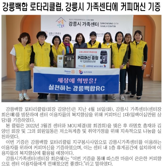 강릉백합 로타리클럽, 강릉시 가족센터에 커피머신 기증