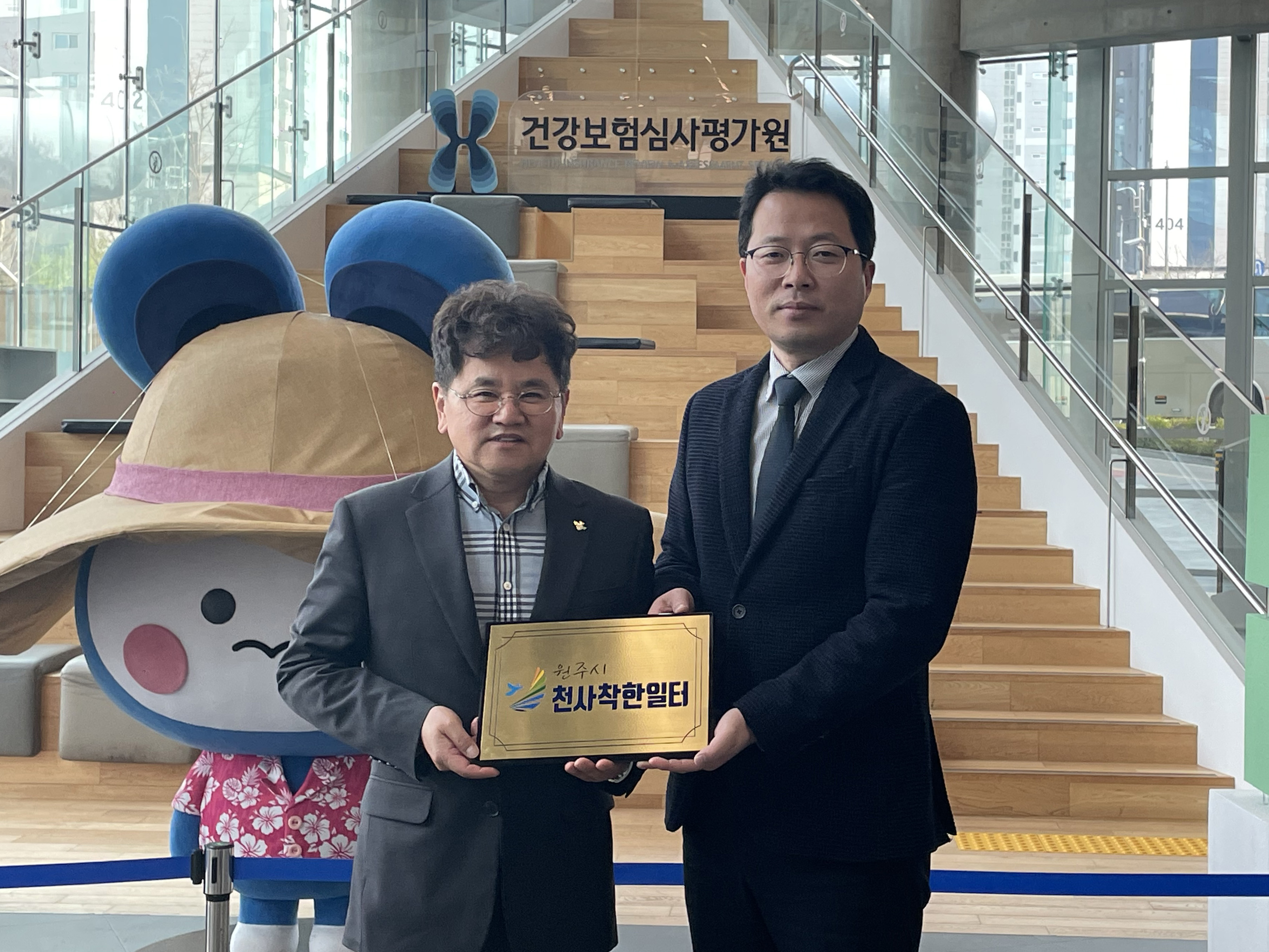 원주시사회복지협의회(회장 박만호)에서는 지난 3월 28일 건강보험심사평가원(원장 강중구)을 방문하여 나눔 문화에 적극 참여한 공로로 ‘천사착한일터’로 선정하여 현판 전달식을 가졌다. 원주시사회복지협의회는 원주시 내 불우이웃, 독거노인 등 도움의 손길이 필요한 사회구성원에 대한 사회적 책임 이행 우수기관을 선...