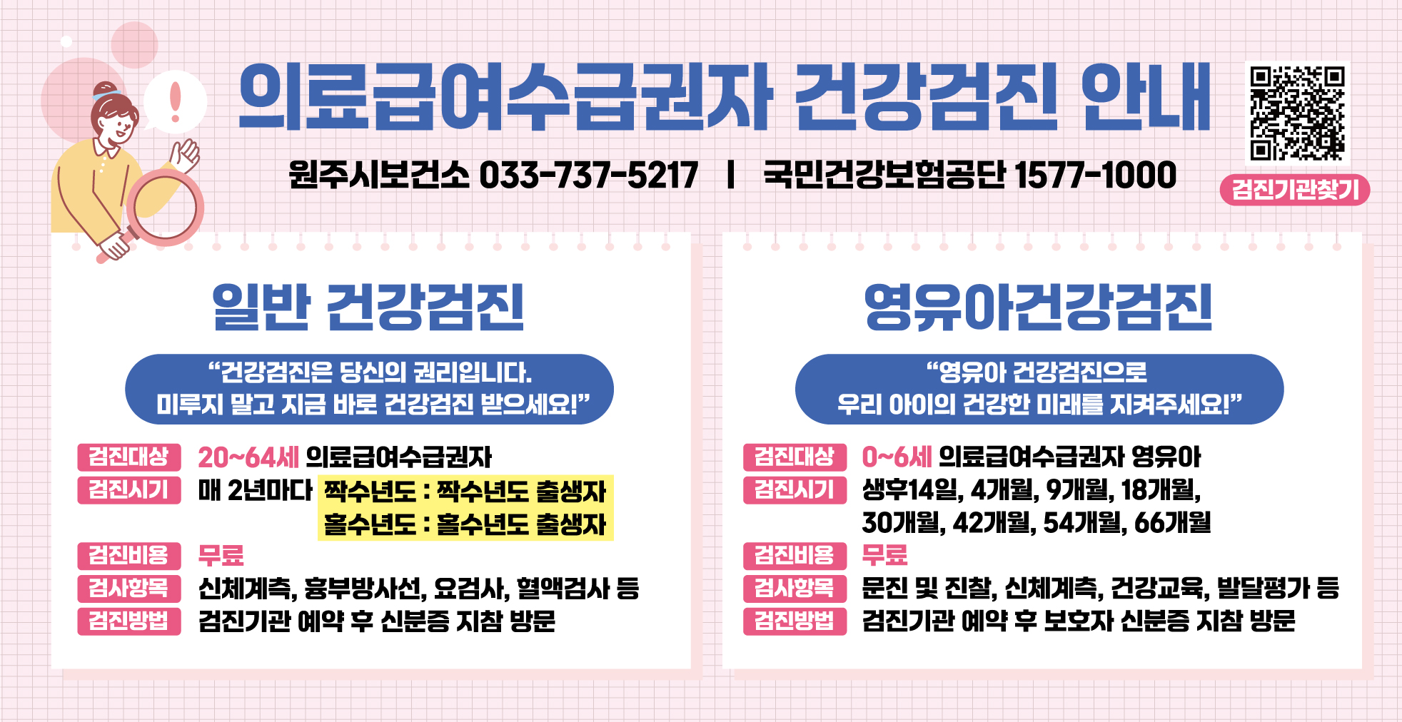 원주시가 관내 의료급여수급권자들의 건강증진을 위해 무료 건강검진을 독려하고 있다. 올해 일반 건강검진 대상은 20세부터 64세(2004년생~1960년생) 의료급여수급권자 중 짝수년도 출생자다. 영유아 검진 대상은 0~6세 의료급여수급권자 영유아이며, 대상 영유아는 월령별 검진시기에 맞춰서 검진을 받으면 된다. 검진 항목...