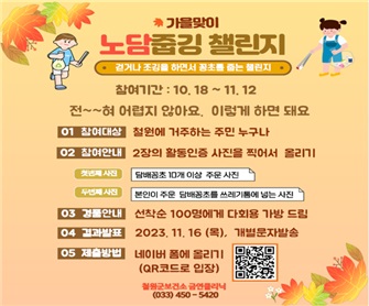 철원군보건소는 가을맞이 담배꽁초 줍깅 챌린지를 실시한다. 국내 연간 소비량 (640억개)의 절반인 320억개의 담배꽁초가 길에 버려지고 있다는 뉴스가 나왔다. 많은 흡연자가 습관적으로 바닥에 담배를 무단투기하는 것이다. 이에 철원군보건소는 건강과 환경을 망가뜨리는 담배를 무단투기하는 인식을 전환하고자 가을맞이...